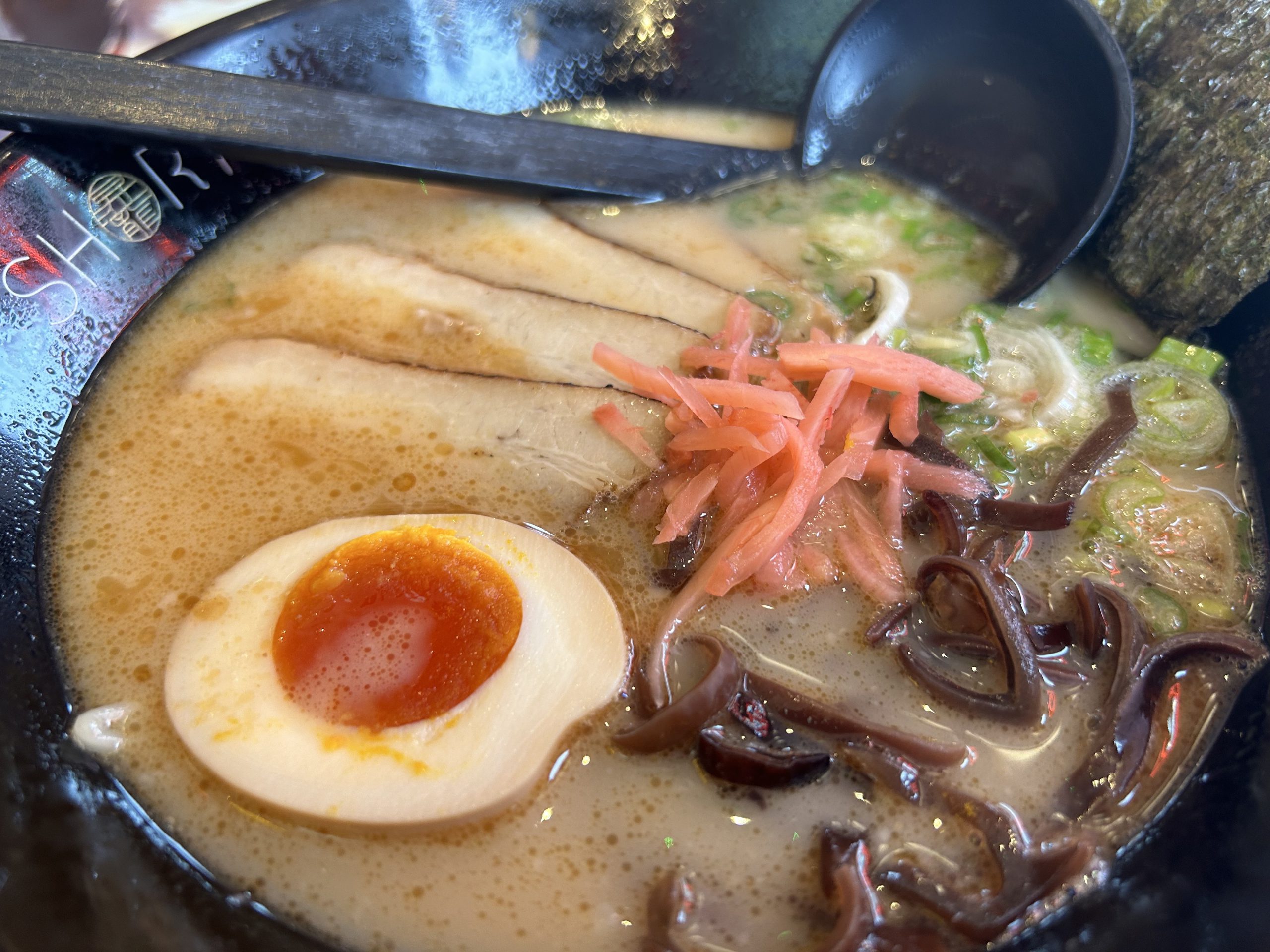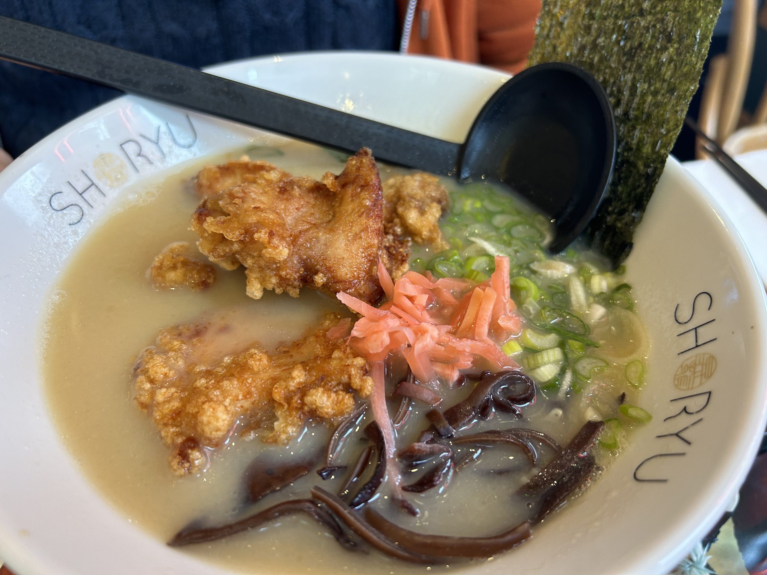 Dann got the Miso Wafu Chicken ramen, which had crispy, fried chicken karaage on top. This broth is white miso, shiitake mushroom, soy, and soy milk – which is also very creamy. We couldn’t taste much of the miso, but there was a good flavor and a lot of good notes in it. The chicken was the star, to be honest! It was crispy, moist, delicious. If we went back, this is the one we’d get! There is a third ramen, the White Natural, which is a vegetarian ramen with broccoli.