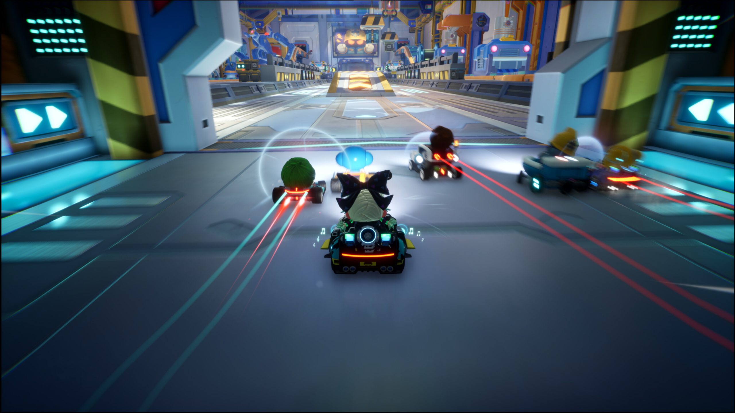 My personal favourite mode is items mode! Much like other racing games, you can bash through boxes that can be found on the map, getting a variety of different items. You can hold two items at a time, which can be swapped between. Some of these items just help you like speed boosts or shields. Others can mess with players; dropping bananas, adding walls into the map, throwing a portal balloon that can trap a bunch of players. These items do mean that you need a degree of luck and fast reactions in order to win, but it’s so fun seeing them in action! Speed on the other hand only has one item you can gain; nitro which is a speed boost.