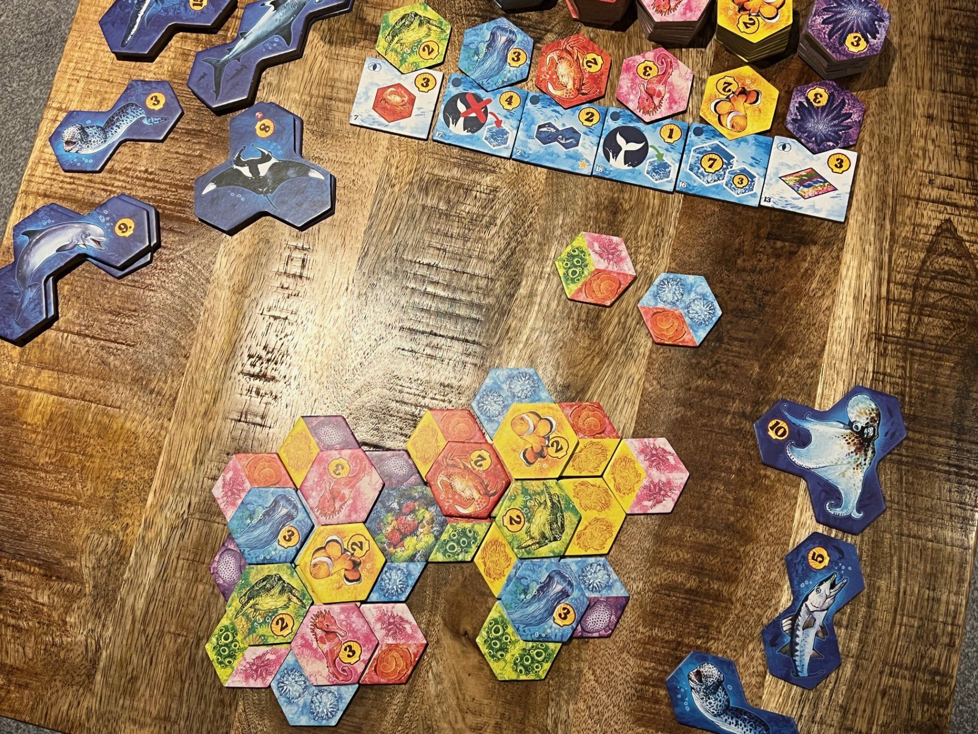 As the ecosystem builds out and more animals are added, players will score for those “small” animals, but depending on how these animals are grouped together, a large animal may then be placed on top of the smaller ones — scoring both for the small and large animals. A further set of randomised endgame scoring tiles adds more spice, and the fact that there are 24 of these which can be randomised makes for a ton of replayability.