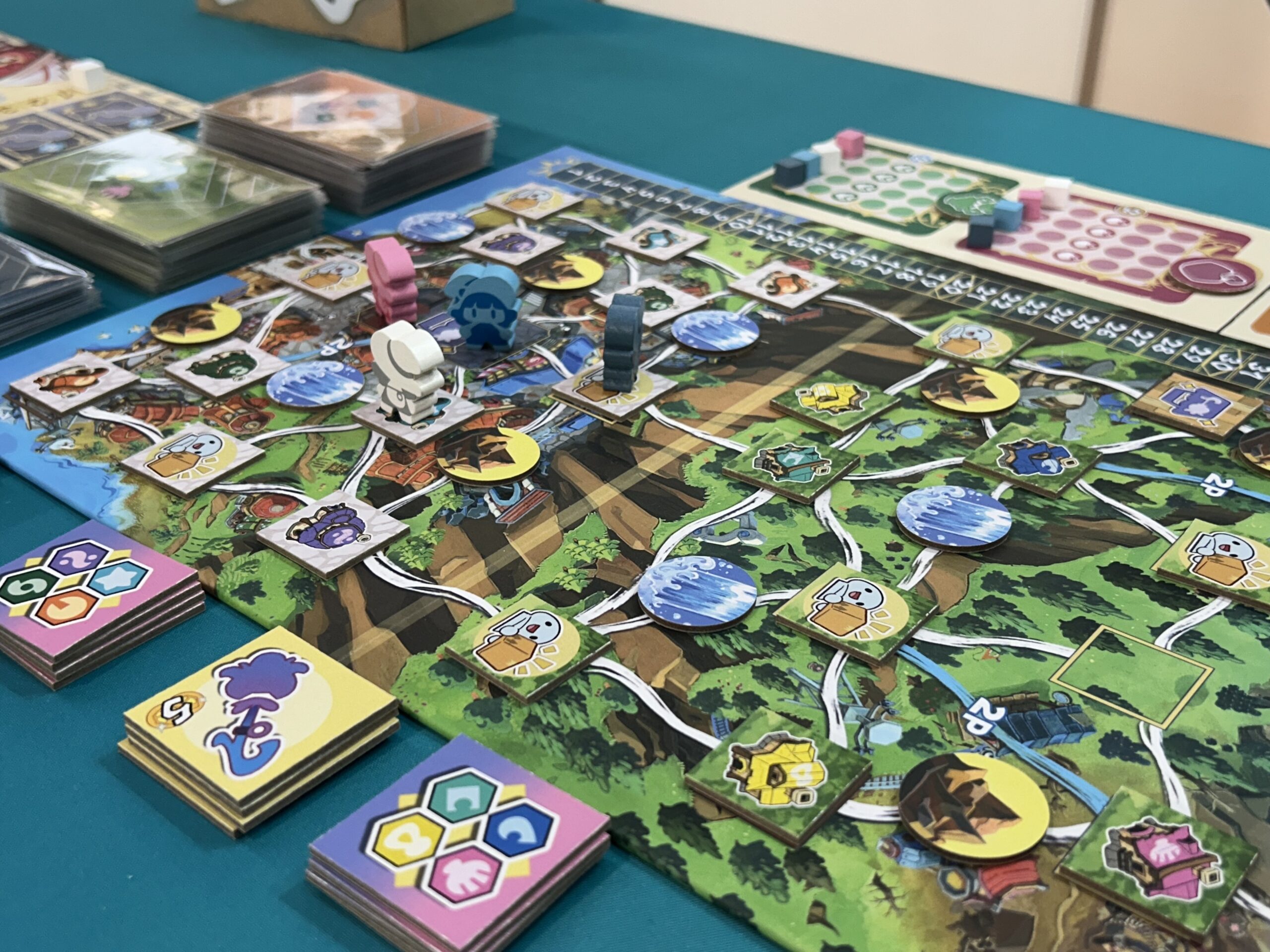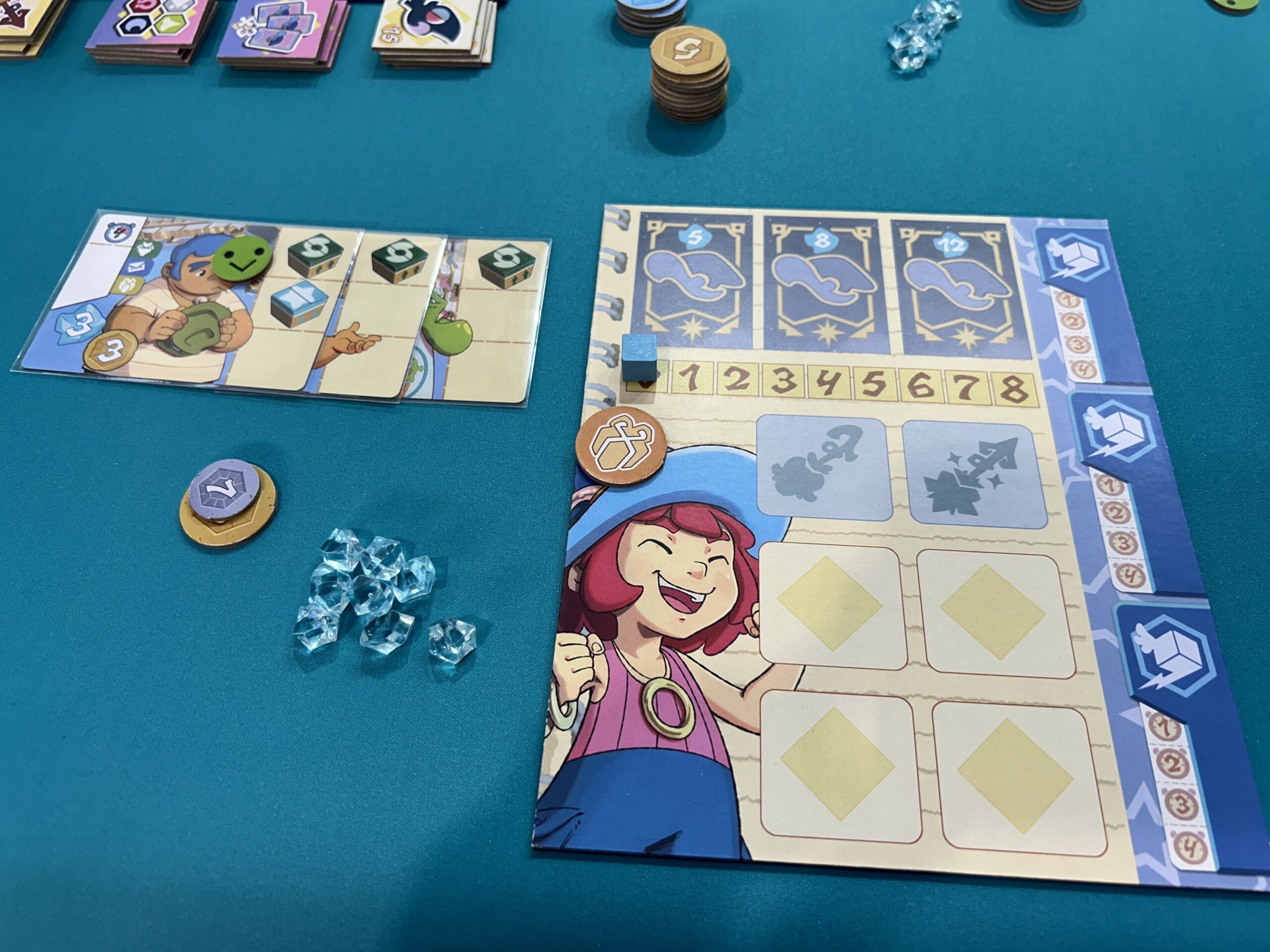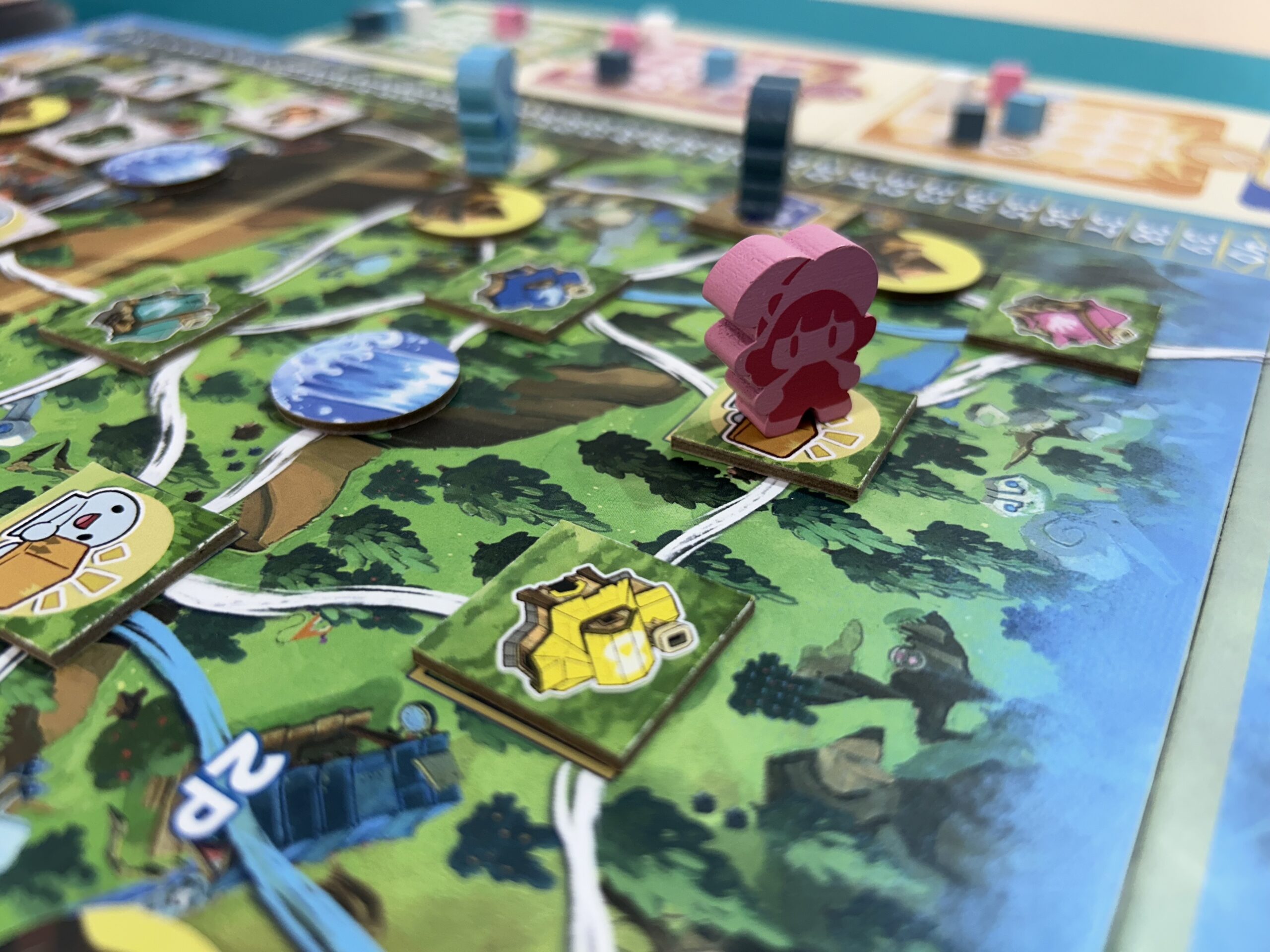 There are a bunch of ways to score points within the game; your large character tile will hold the upgrades you’ve made to your character, along with any achievements you’ve gotten. When you complete a delivery, you do have symbols on that card that allows you to move up in a group experience area. If you are the first to cross the middle, you get some extra points at the end of the game. There are also tiles along the board that can be earned from doing stuff like delivering one of each type of package in that area or delivering four of the same packages. The game ends when someone has completed four achievements, which then triggers a last round for everyone.