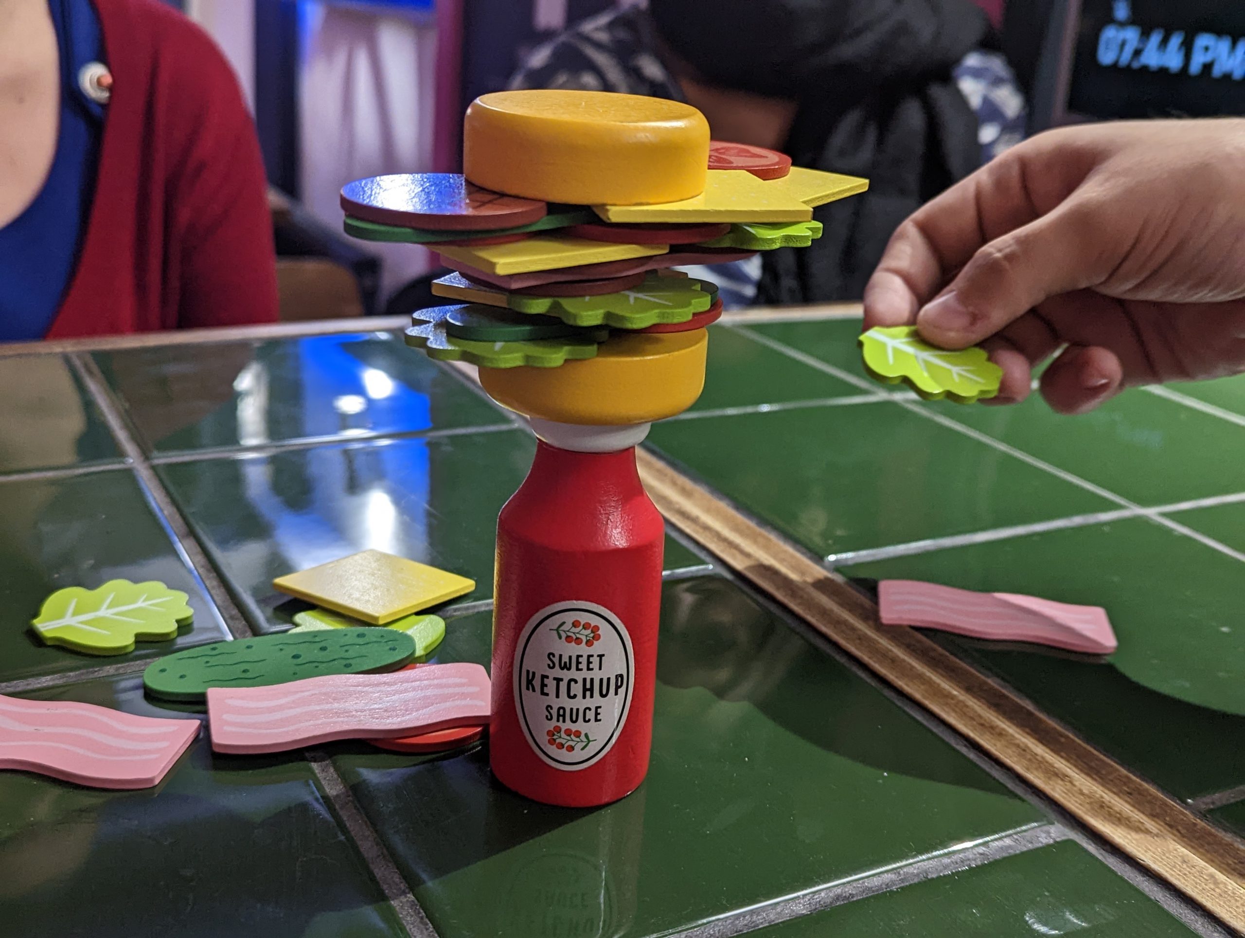 Some tabletop games have taken on a new sort of life; games like Jenga and Rhino Hero, that are all about balancing and attempting to keep things in a pile without knocking them over. These types of tabletop games always have a lot of showmanship to them, where people are often holding their breath and watching intensely, seeing if others mess up. Burger Balance is one such game, but there’s a distinct food theme; it’s about a burger on top of a ketchup bottle.