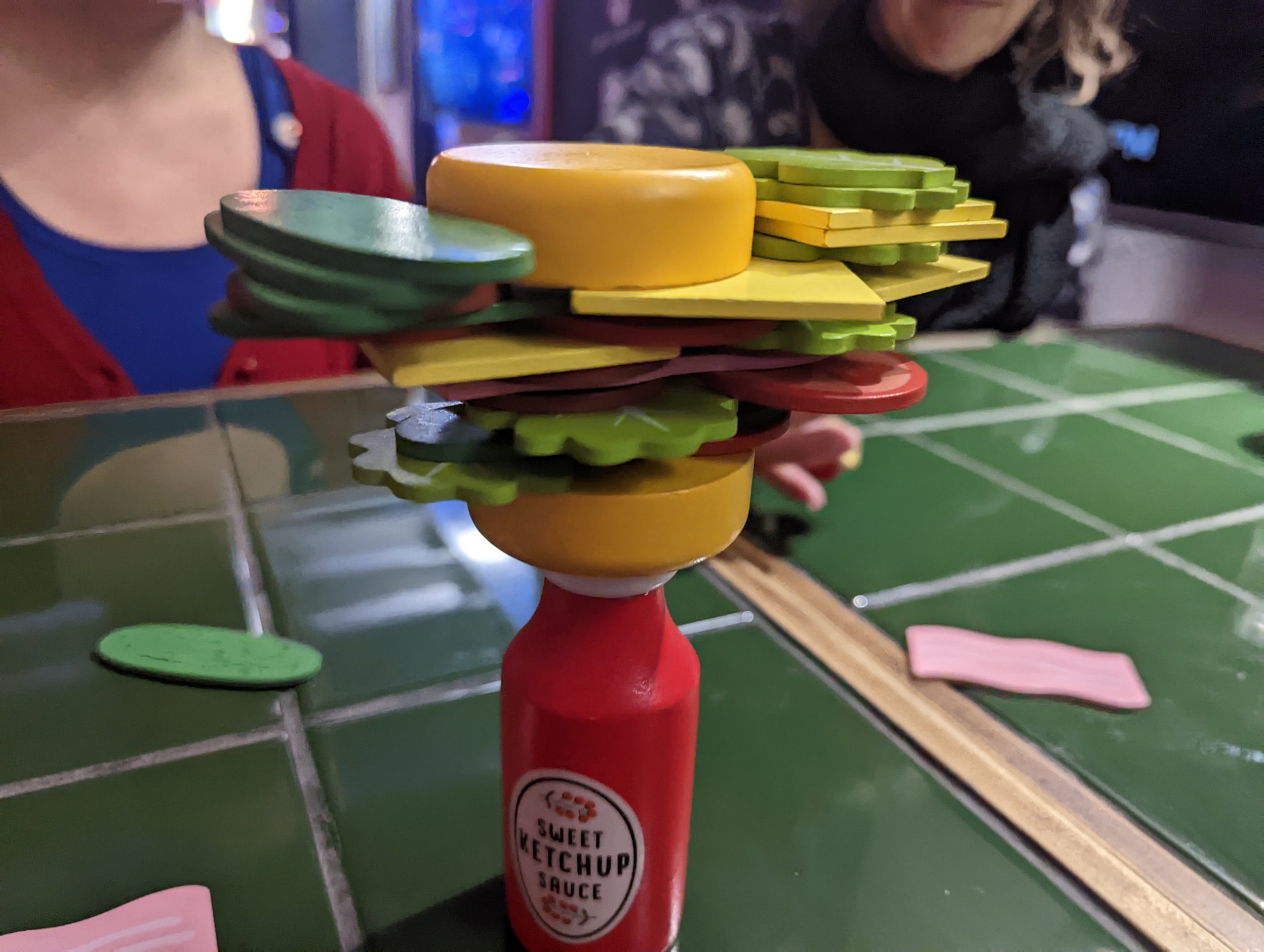 In Burger Balance you all will win if the burger ends up completely filled. You cannot, of course, put items on the top of the burger bun, so building out does create a wild looking burger, unlike any you’d be able to order. It’s a really simple game, feeling like a reverse Jenga, where you are to build up your tower instead of taking pieces off. It’s a really fun game for all ages and can easily be given to children to play on their own!