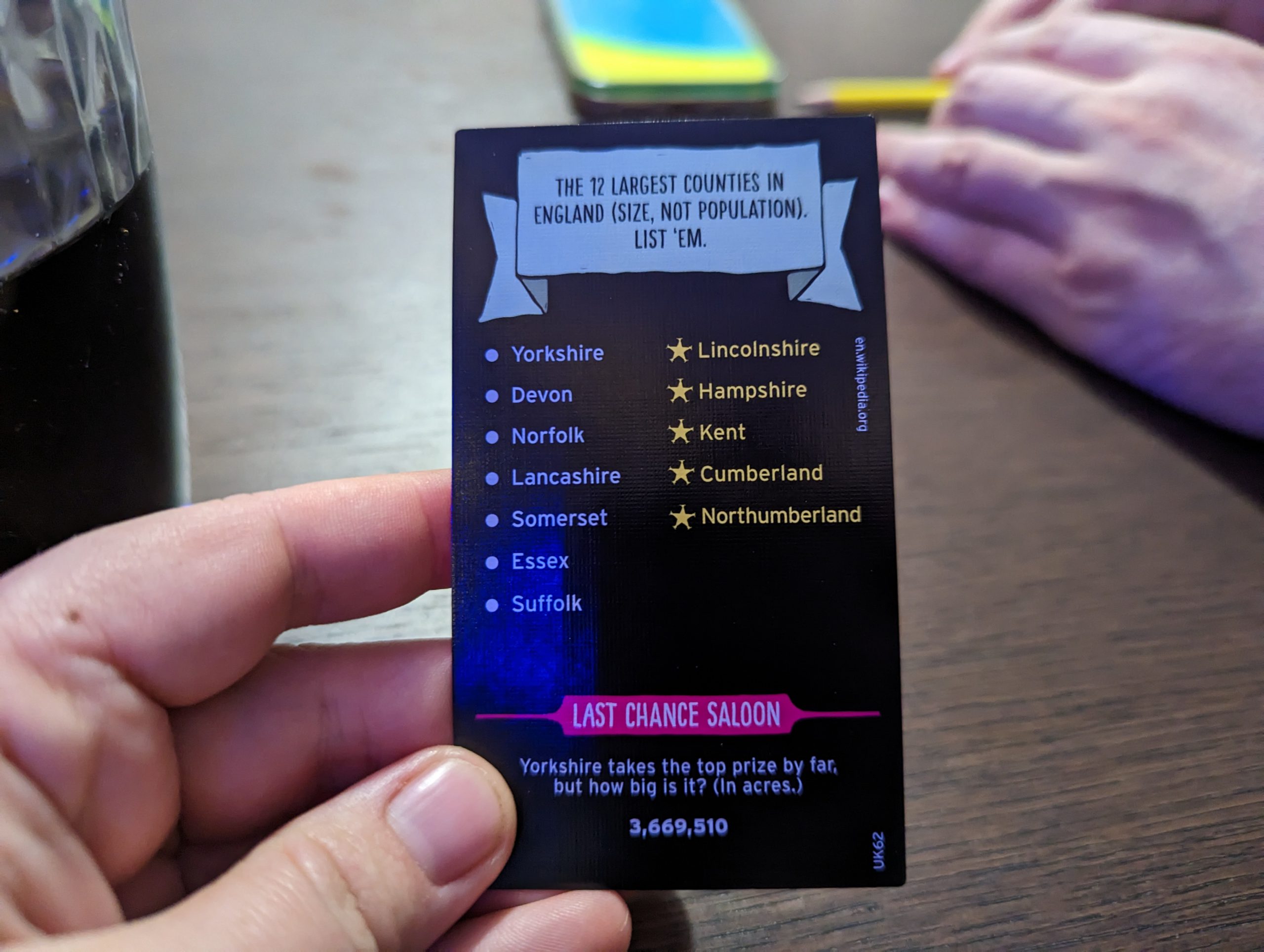 Once a question has been read out, like name the biggest counties in England by population, you and your team have a minute to write down as many answers as you know. Pencils are not included, but a paper pad is. This list will help you when it comes to the second phase, where you will need to pool together your best answers. The quiz master will have one team going first (rotating each round) who will then say one of their answers. If it is on the card, they should mark it on their paper, and if the other team has it on theirs, they should mark it too, so that they do not say it.