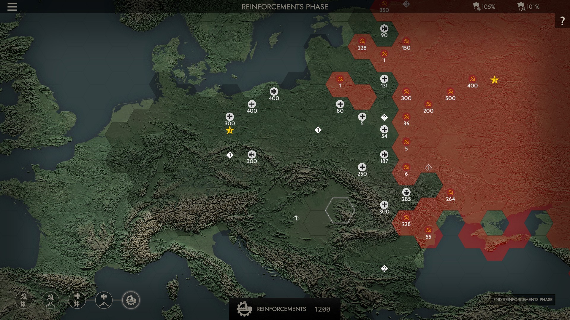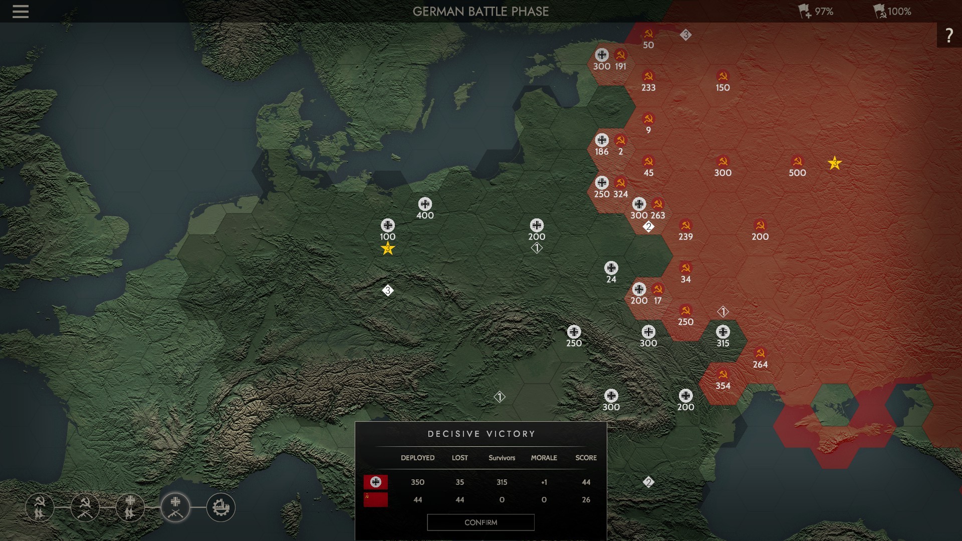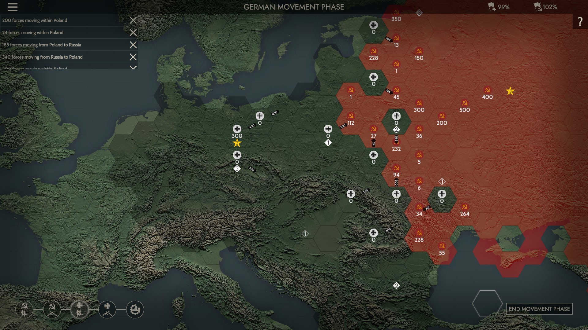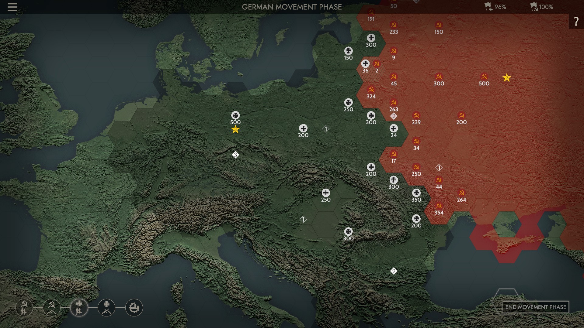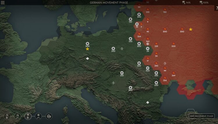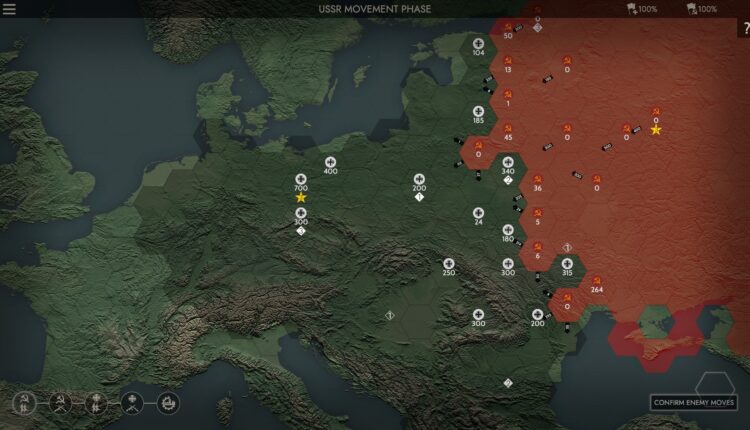 One of the best starting options is that you can play as either Germany or Russia. From the overhead, strategic map, you don’t know exactly what units you have. It’s all done with ‘circled numbers’. Then, like any other game, when you and your enemy try to occupy the same region, the battle begins.