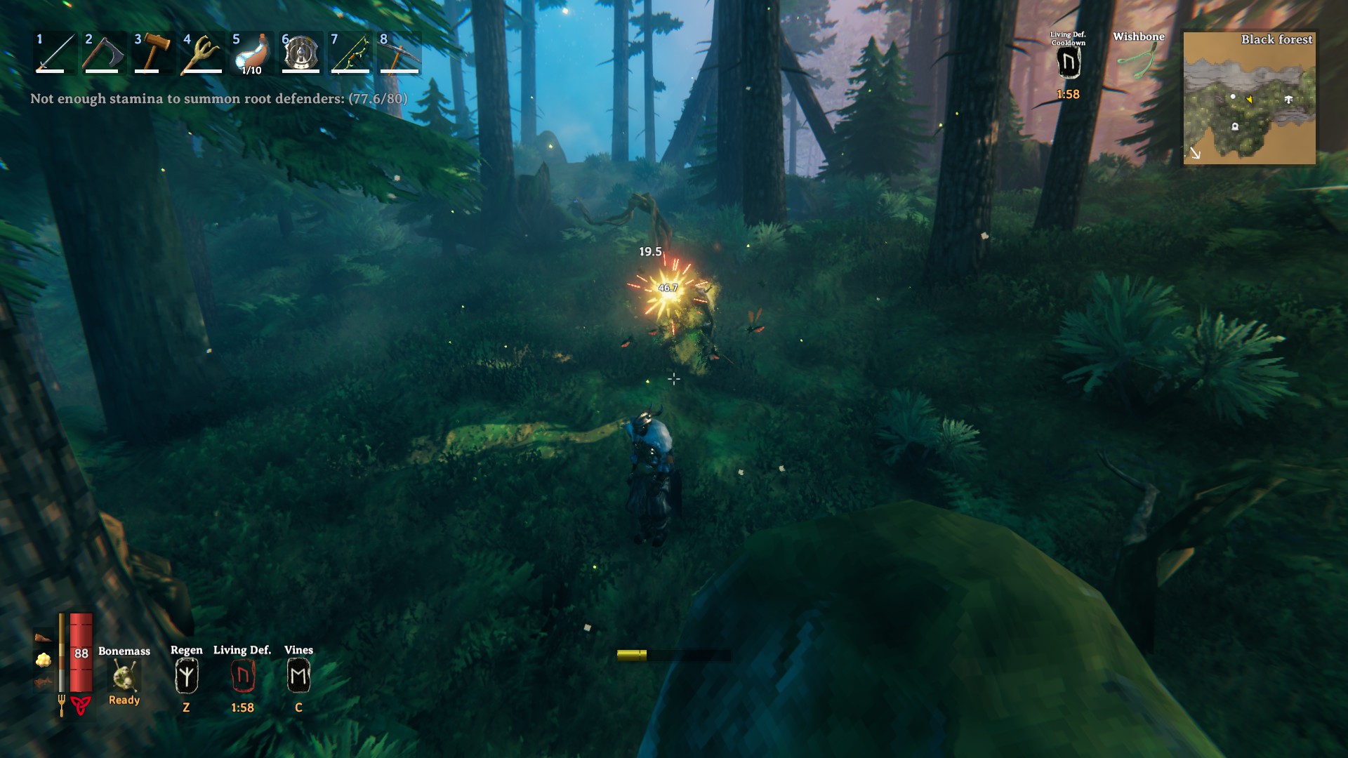 The final ‘vines’ ability is amazing when you get it right, although it can be a bit tricky to aim and judge its maximum distance. A press-and-hold ability, it spawns the same vine tendrils the Elder does during its boss fight. It can do a hefty chunk of damage to dangerous creatures like lox and stone golems, but be wary – its animation has a fixed duration no matter how long you press the button. Quite often I have been left standing like a lemon with my arms outstretched only to be batted into an instant gravestone. Make sure you’re standing far enough away, can kill it in one hit, or have a friend around to distract or finish it off.