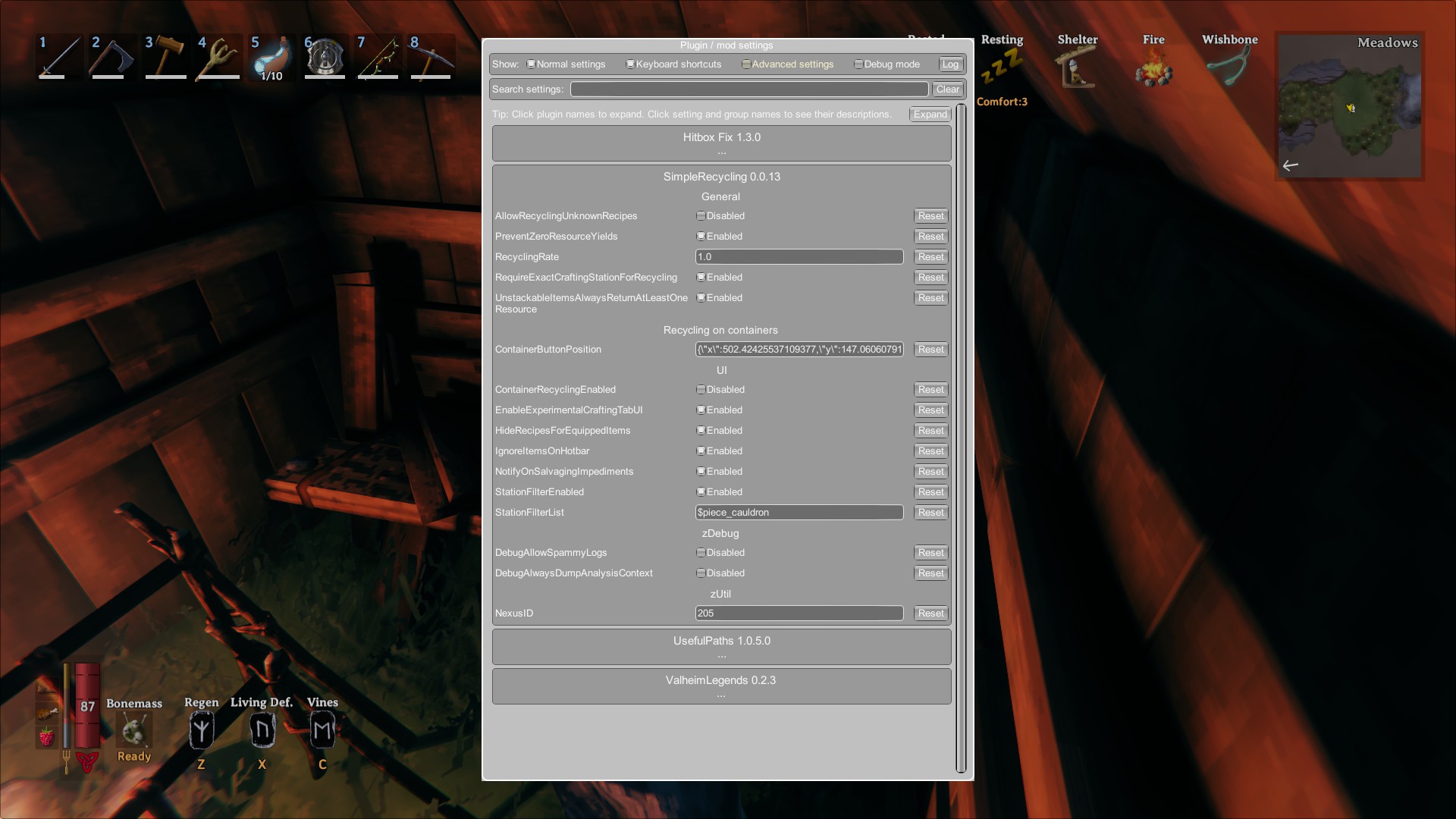 With Simple Recycling, you can solve that problem. By default, it lets you recycle items to recover half of their material costs, including upgrades. Because we’re big fans of Valheim giving us all our stuff back when we destroy buildings, we went and modified the settings to give us all the materials back. It felt great to be able to put all the metal to use again without heading off to mine more.