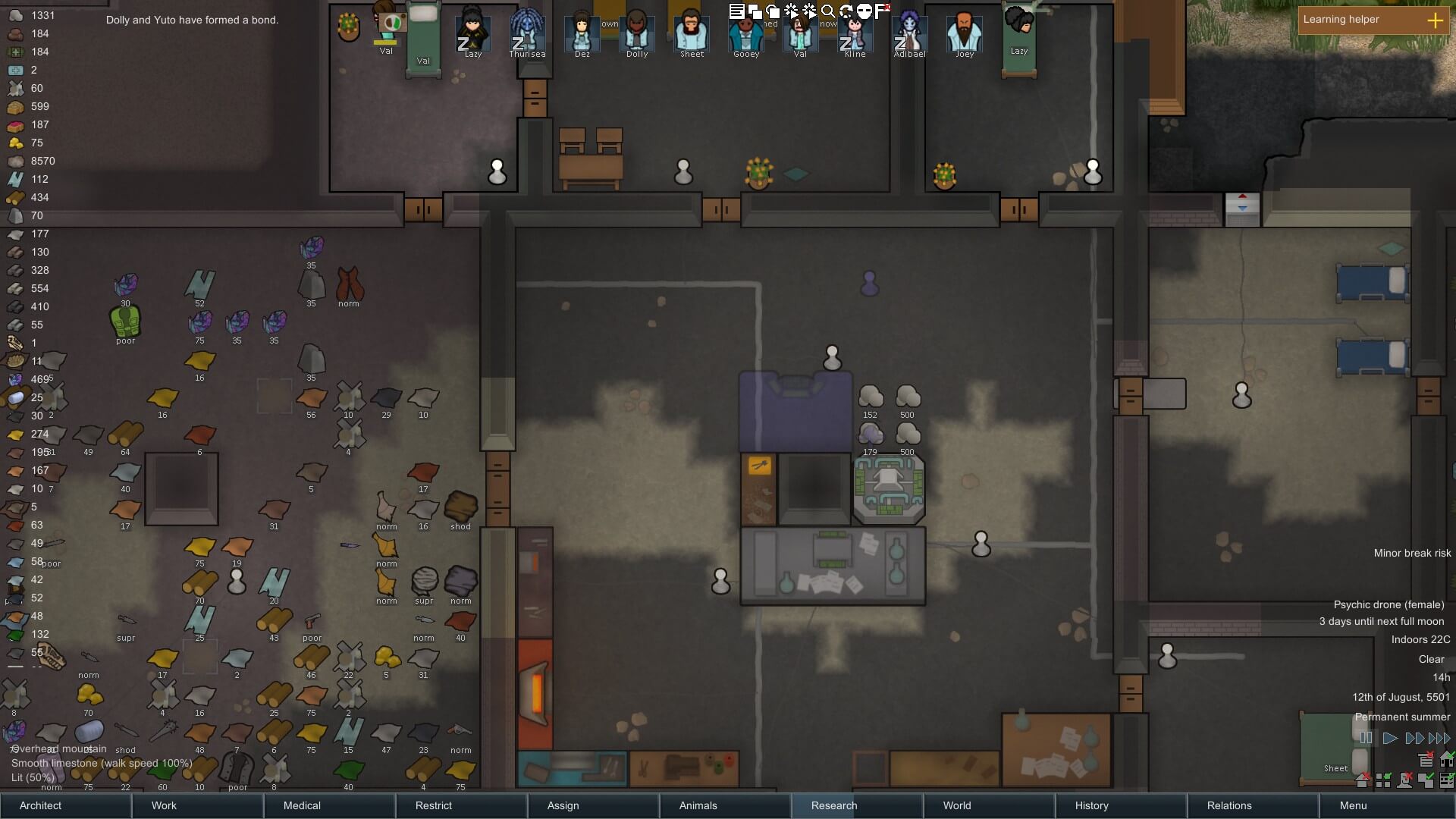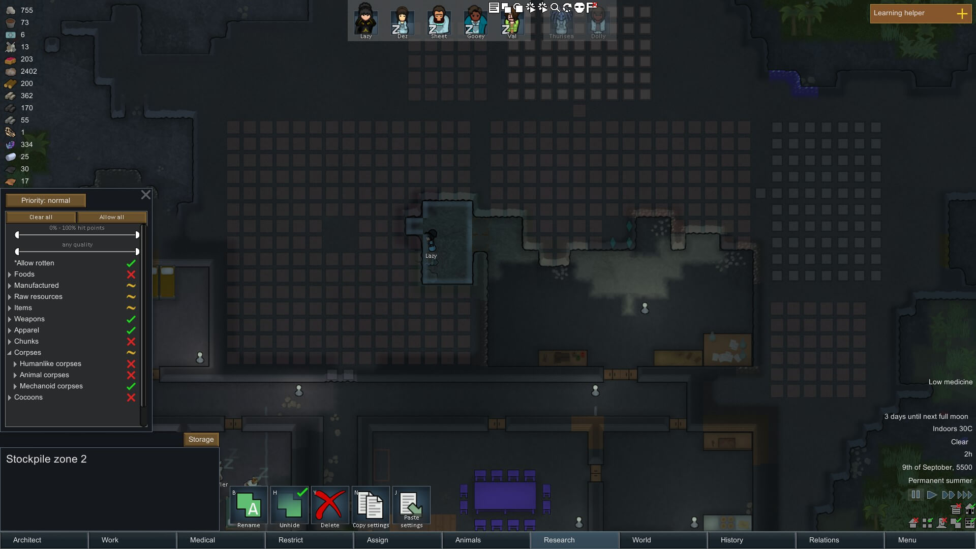 Crafting, especially as your colony grows, takes a lot of resources. Whatever dinky little room you kept them in when you started just won’t live up to the task, so it’s time to build a big one. This job’s pretty simple, though: make it around the same size or slightly bigger than your crafting room, cover the floor space with a stockpile zone, plonk some lights down and forget about it.