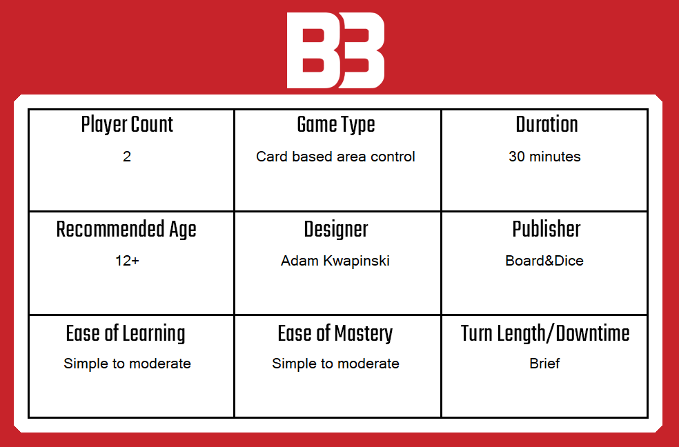 Inbetween is one of a growing number of games that offer thematic and mechanically satisfying experiences in a small box form, without compromising on quality when it comes to board presence, component quality or in any other way. Yes, Inbetween supports just two players, but it is reasonably varied from one game to another in terms of setup, but the strategy of selecting and using cards whilst attempting to manage resources allows for multiple playthroughs in a single session.
