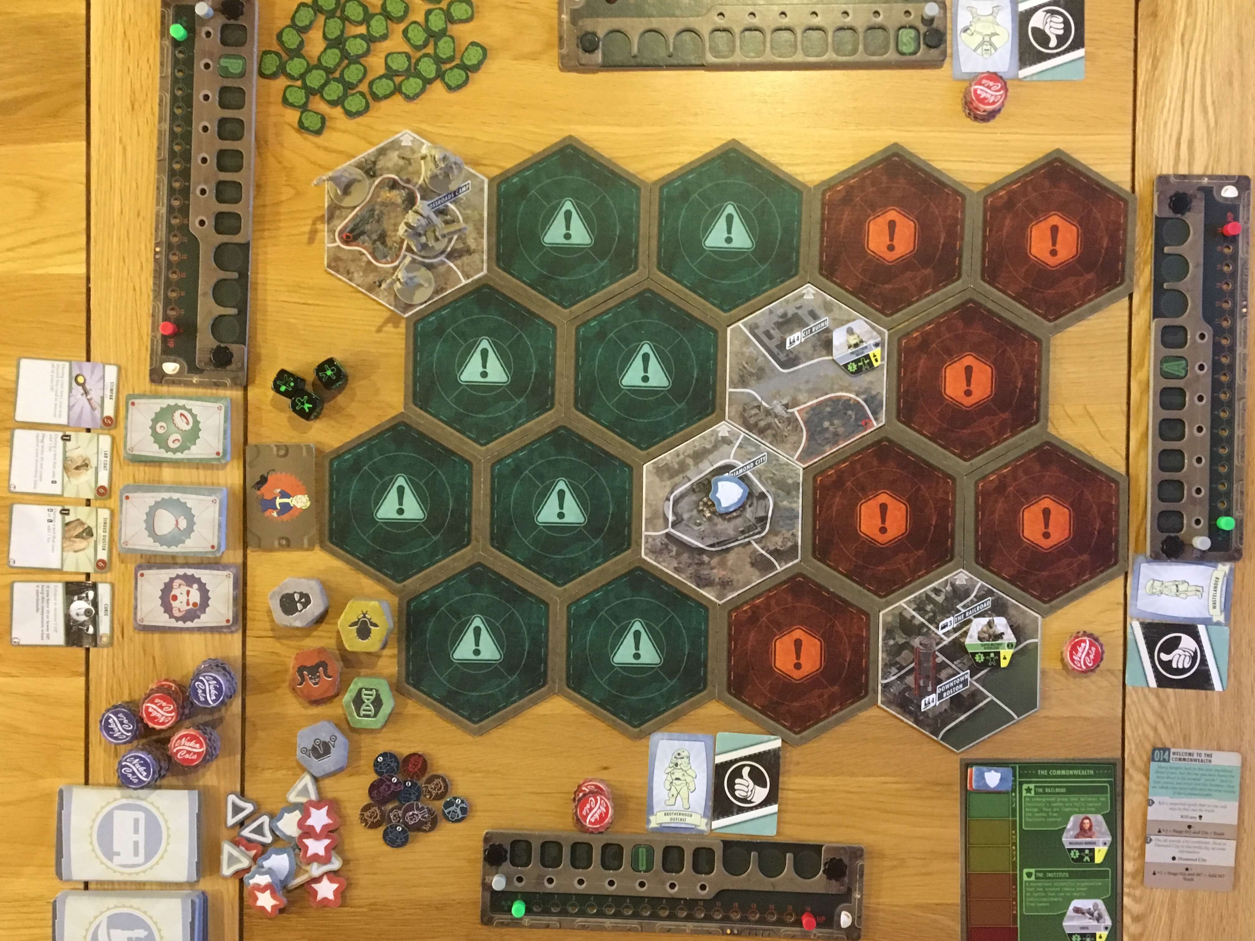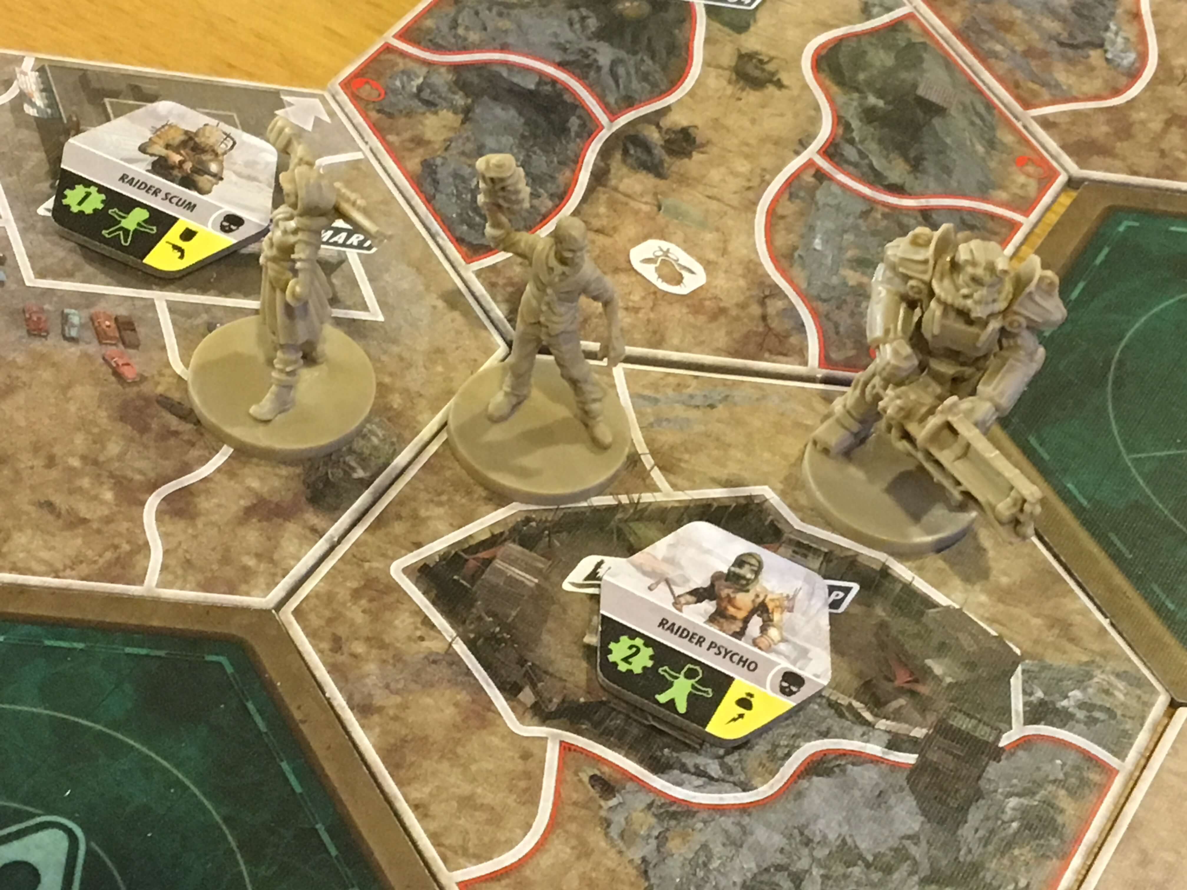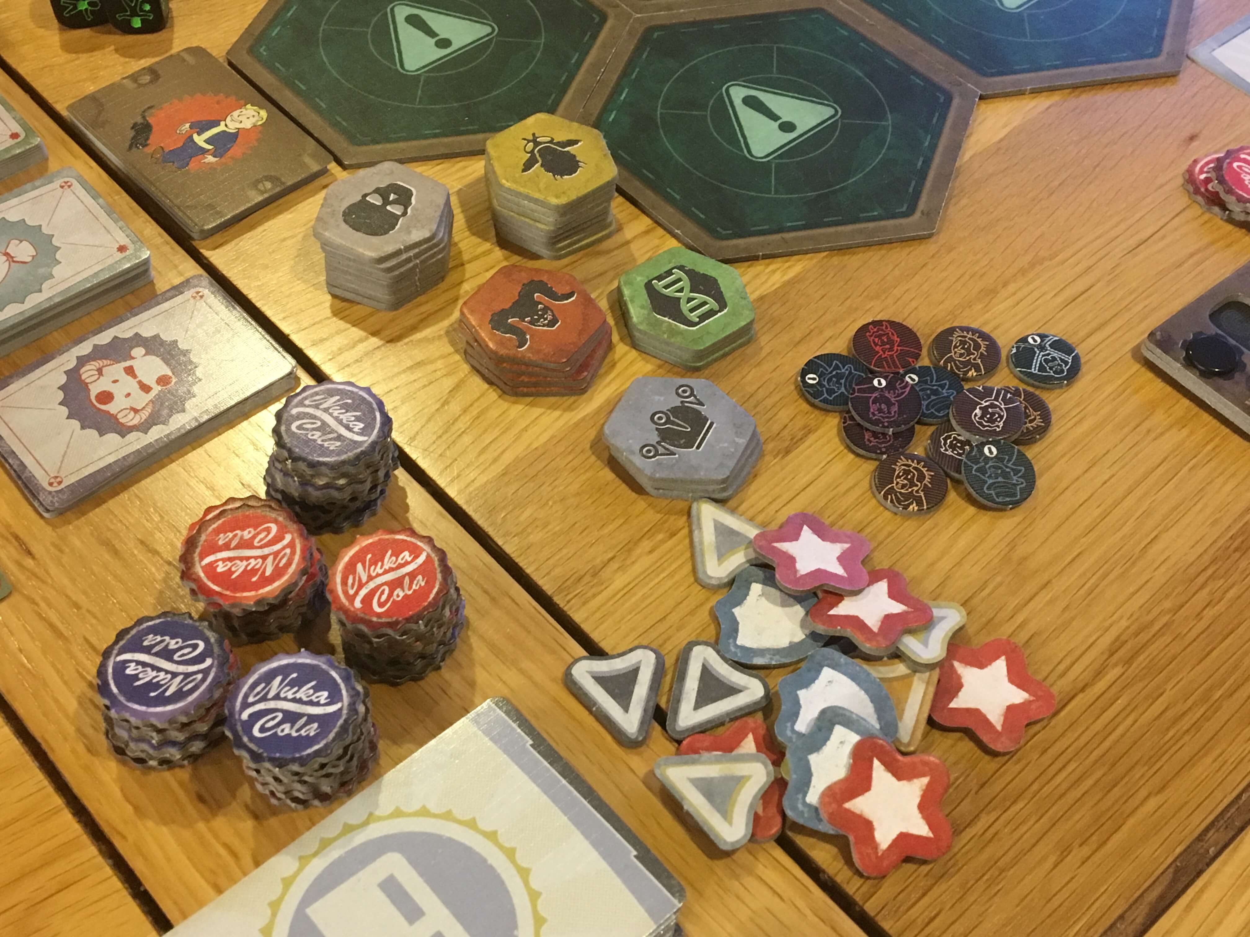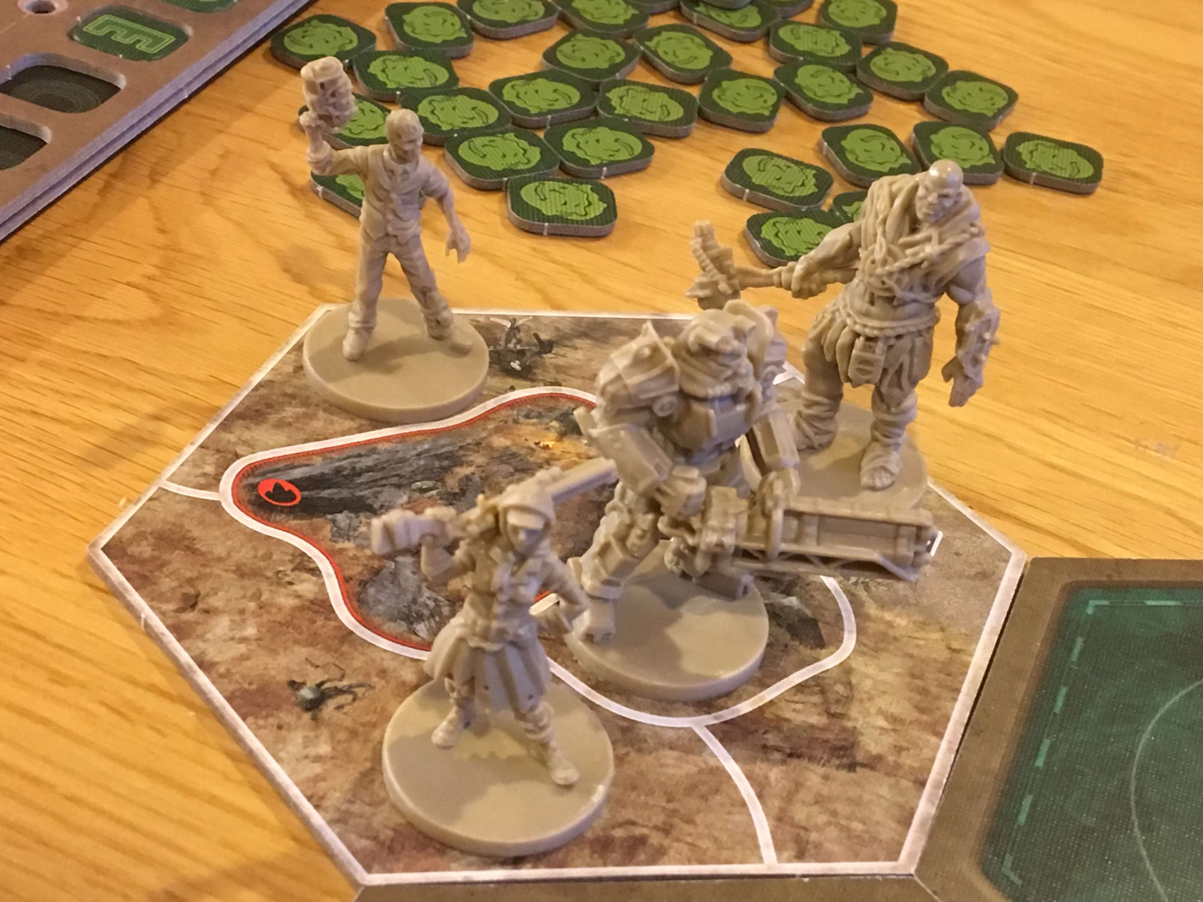 The board pieces are of a decent thickness with a nice, appropriately designed theme. All are clearly laid out to indicate normal spaces as well as radioactive and challenging terrain, whilst enemy spawn points and other locations are identifiable without need to refer back to any manual. Although the board is made up of modular, hexagonal pieces that must be flipped, it rarely ends up moving around during play.