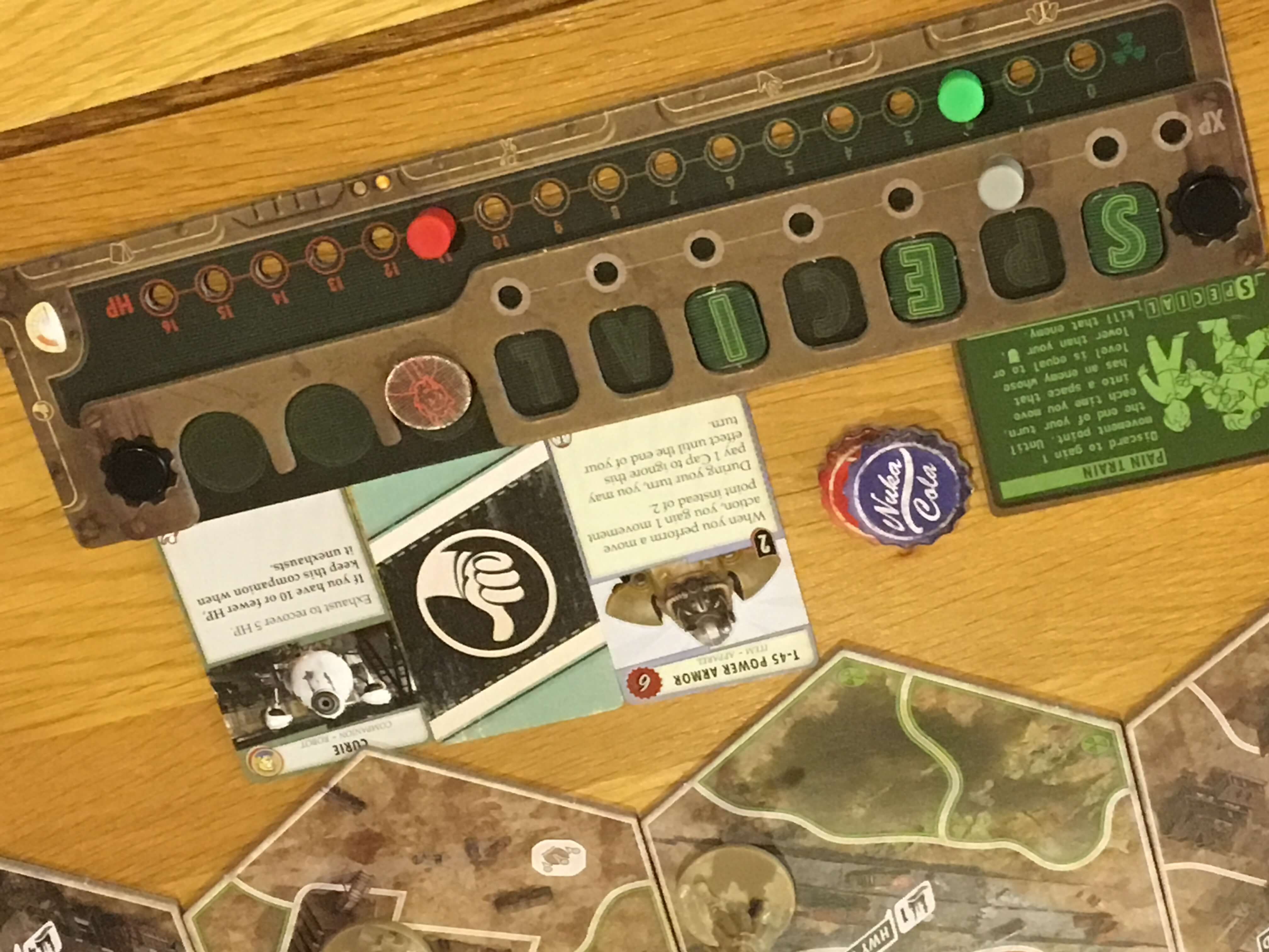 The game itself uses a modular board that has fewer (single sided) pieces than it might, but there is enough variation between them and the cards that drive the action to create sufficient variety. Board pieces are revealed only when explored, with random encounters drawn on certain spaces and enemies on others. Encounters are drawn from a face down deck and usually result in a multiple choice decision that may require the active player to test one of their SPECIAL traits (strength, perception, endurance, charisma, intelligence, agility and luck.)