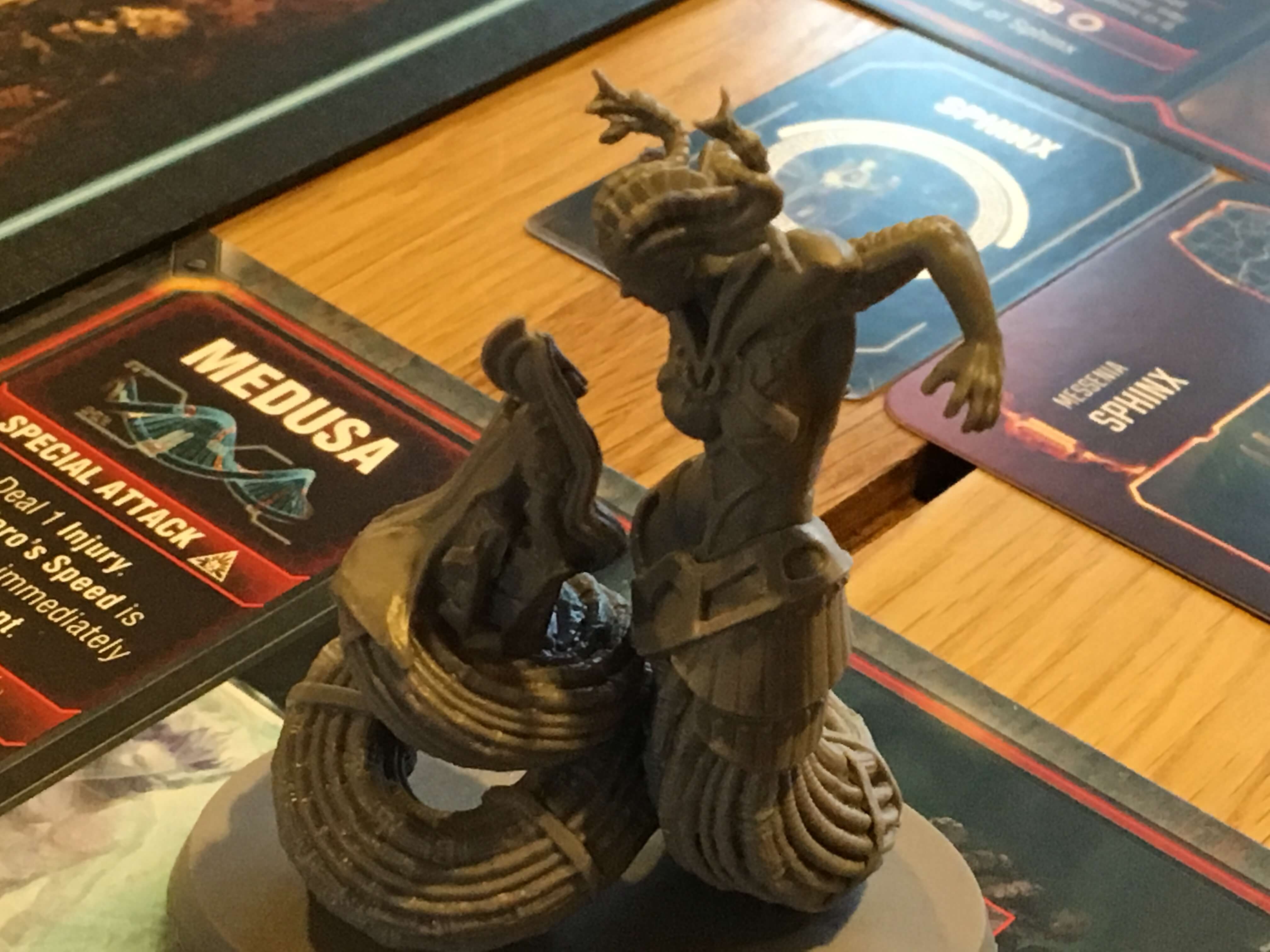 Considering it has a fairly high RRP, you may expect that Lords of Hellas is a box full of beautiful things; and it is. What you might not be prepared for is just how much stuff it contains, or how simply and effectively all that stuff comes together to make an excellent game. Set within a single plastic organiser, you’ll find seven monsters, four heroes and three huge god statues split into four pieces each. You’ll also find one of the most attractive boards I’ve ever seen, as well as around a hundred hoplite and priest figurines in eight different sculpts and four different colours; Not to mention several decks of cards, two booklets and a few other odds and ends.