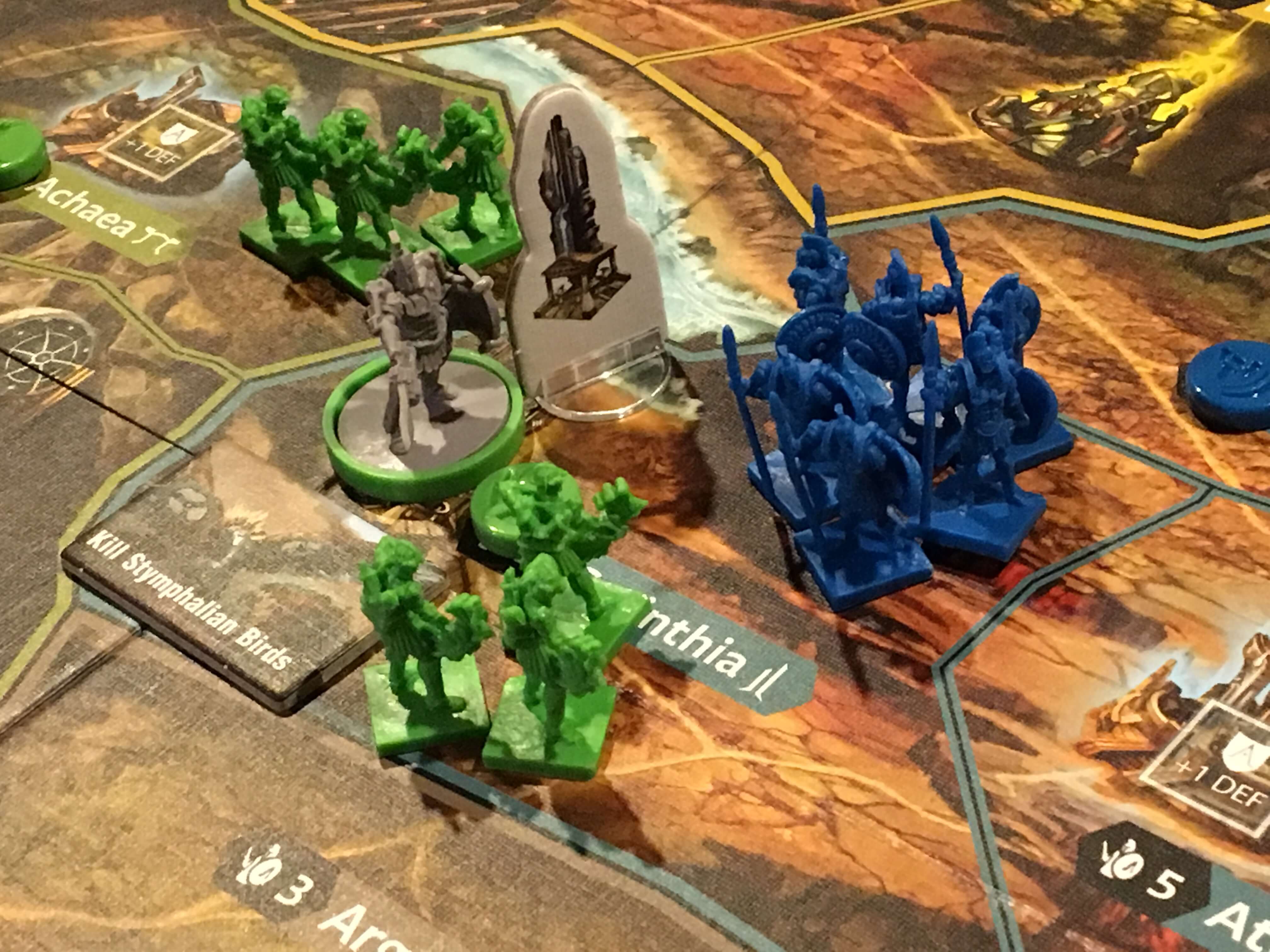 I’ve mentioned the fluidity of Lords of Hellas’ gameplay already, but ironically, that flexibility which I love about it might just make it hard to structure an explanation of what happens in game. That’s mainly because, whilst Lords of Hellas has a structure that passes turns from one player to the next much like any other game, what players actually do on their turn is highly variable. Usually, the choice of what to do will depend on which of the win conditions the player wants to target, as well as the current board state.