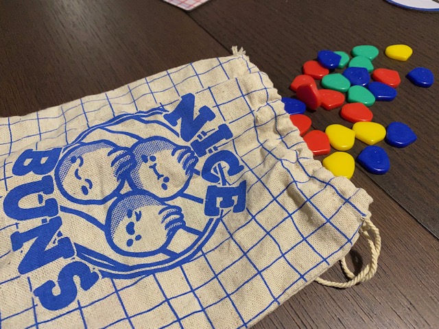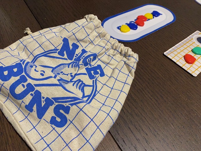 The bag of random buns in Nice Buns is a lovely cloth bag, full of smiling buns that are super adorable. You can use these at the end of each round to refill the plate in the middle. If you ever draw a fish head bun, represented by a dull grey bun token, you will find a problem on your hands. The fish head bun combines with whatever color you have the most of that are not banked in your plate. In Nice Bun, this is a really yucky bun, that needs to then be passed on to someone else or put back in the bag using the largest dice. You cannot bank anything until you get rid of this fish head bun, as it moves around your piles to the largest one.