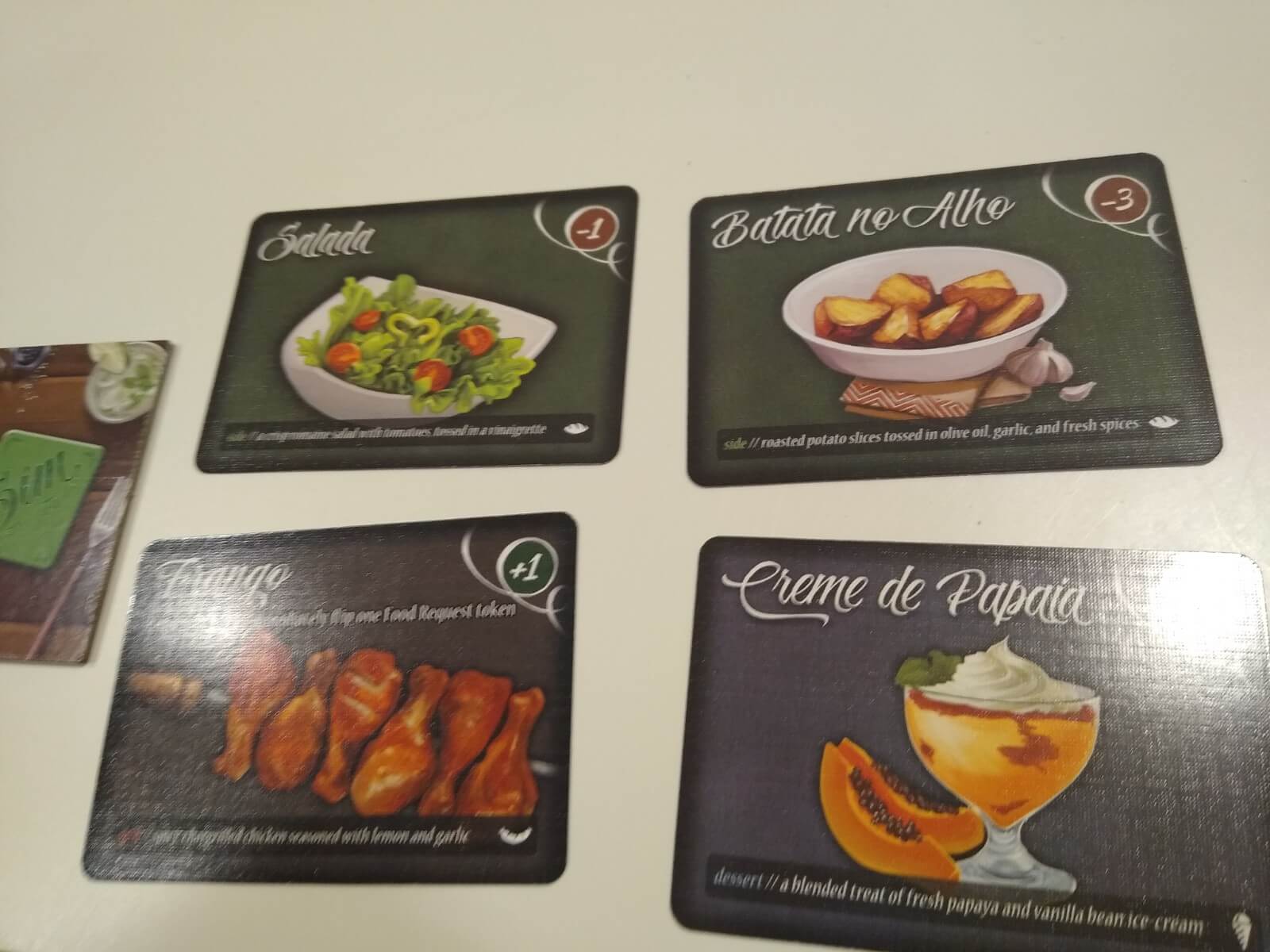 Churrascaria is a very simple game, with one thing to keep in mind; eat meat and do not fill up on anything else. You and every other player at your table are all at a Brazillian restaurant, where you must eat the most meat instead of filling your stomachs full of side dishes or desserts. Each player is given a cardboard token which has a green side and a red side. They are also given a basic rules card, a salad card (which is worth negative points) and a meat dish called Frango. You’ll also get four action cards in your hand.