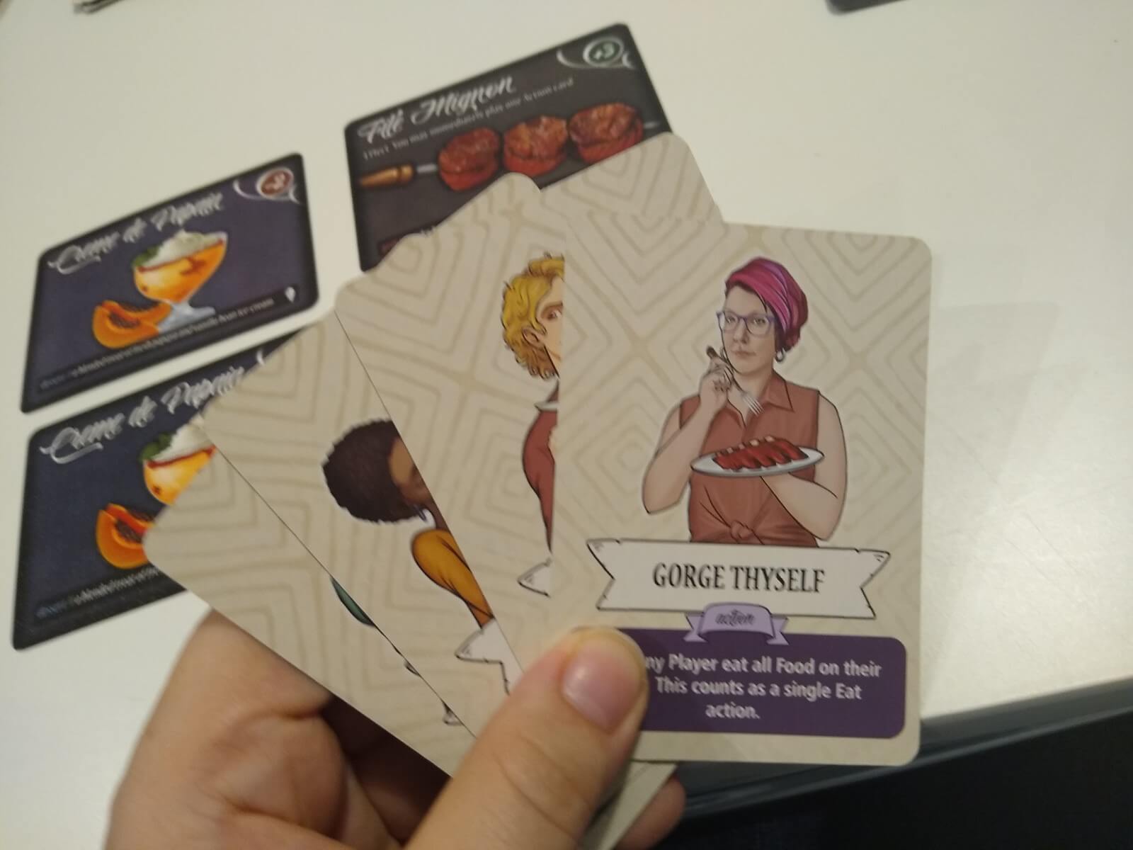 Food cards have positive or negative numbers on them, depending on the food. Some also have different actions which can be triggered by eating that food. They also have lovely, mouthwatering descriptions that make you want to try the foods that are being passed around — even the desserts.