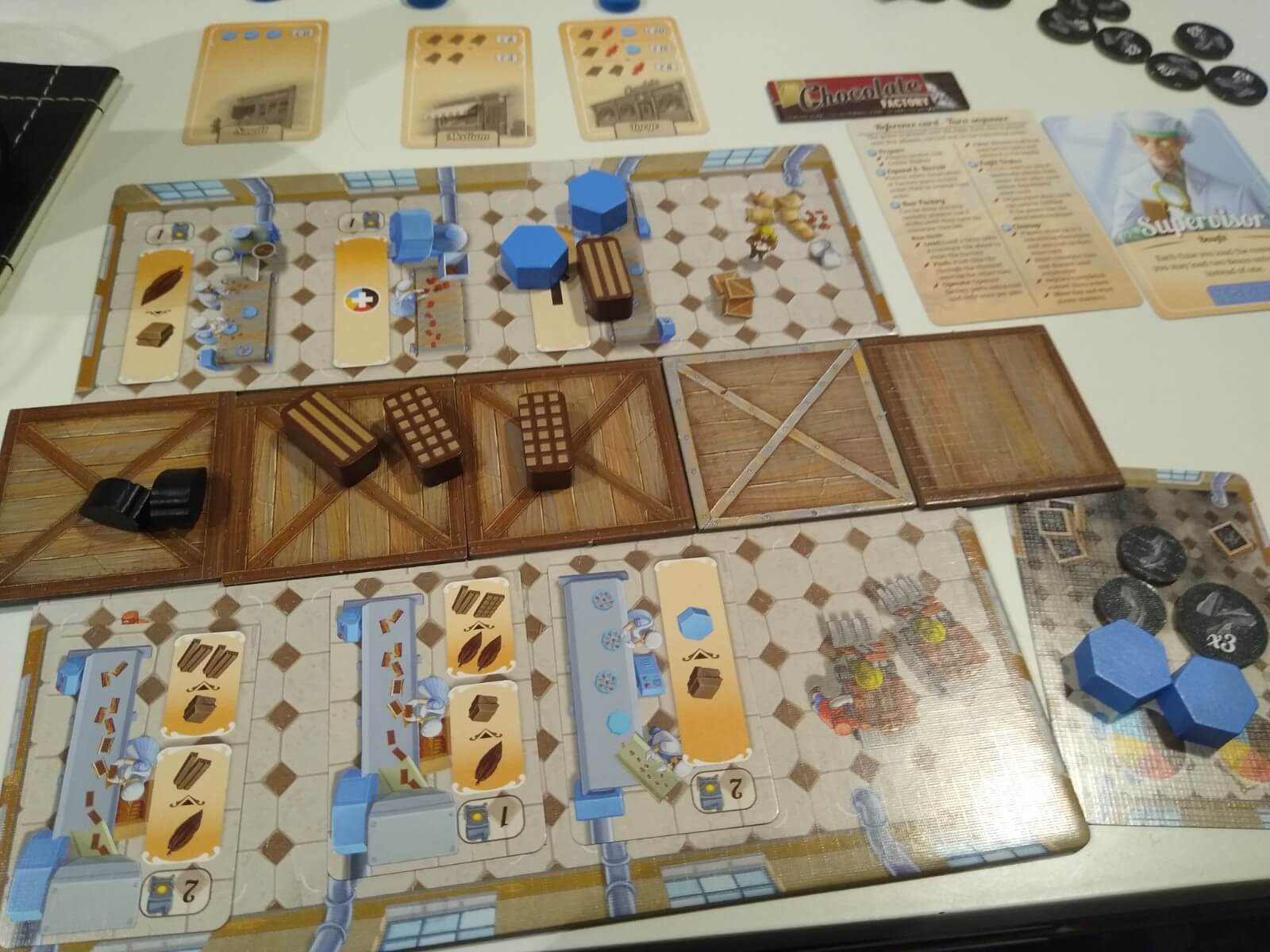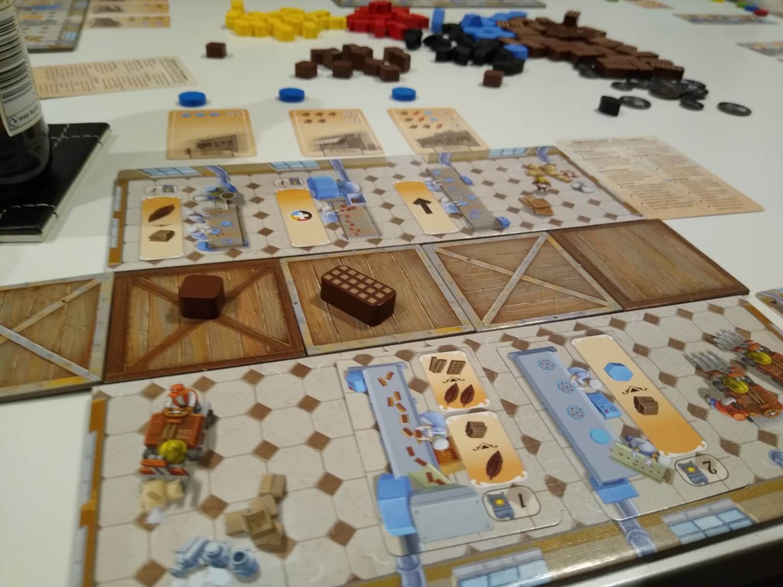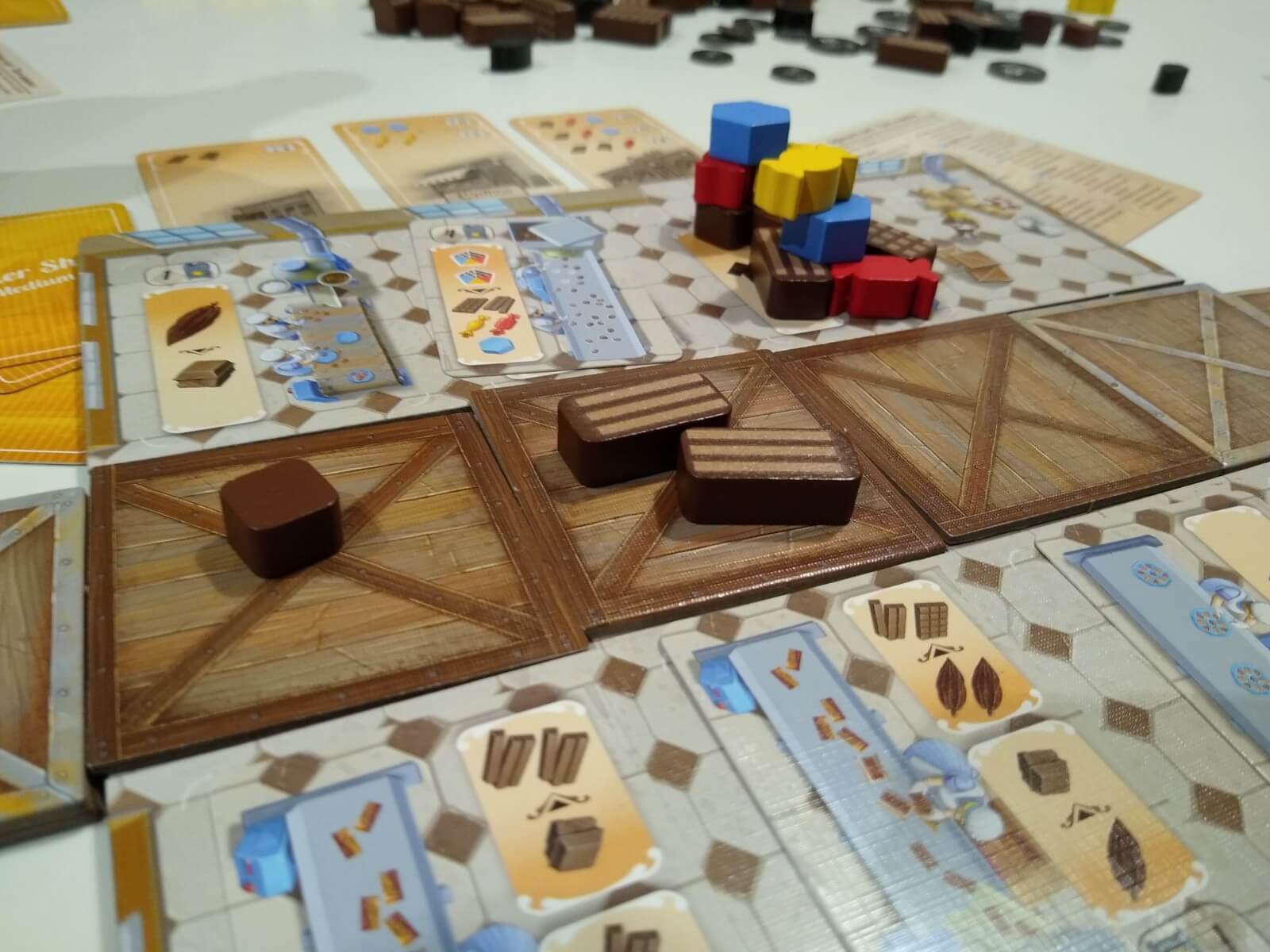 Chocolate Factory is a really fun game once everyone understands how to play. Every player is given a starting tile, which represents a factory. These tiles are really important as they show different areas that contain machines needed to make cocoa into chocolate and the chocolate into candies, as well as send your items out to consumers or your own storage area. The factory card has a middle slot representing a conveyor belt that can hold a few crates. This is a really lovely design as you can literally push the crates with a new crate along the conveyor belt middle, showing where your chocolates are for that turn and adding a lot of fun into the game!