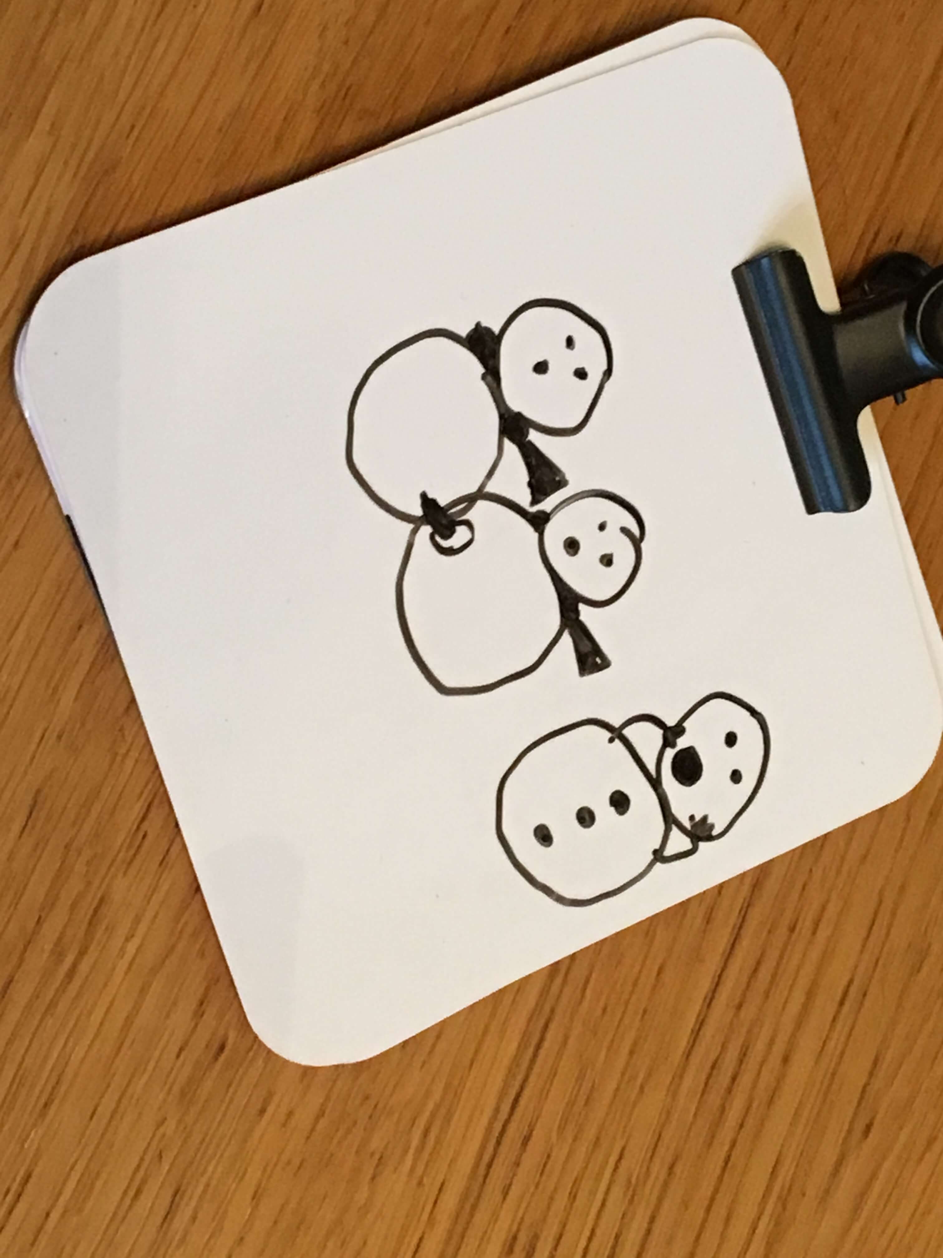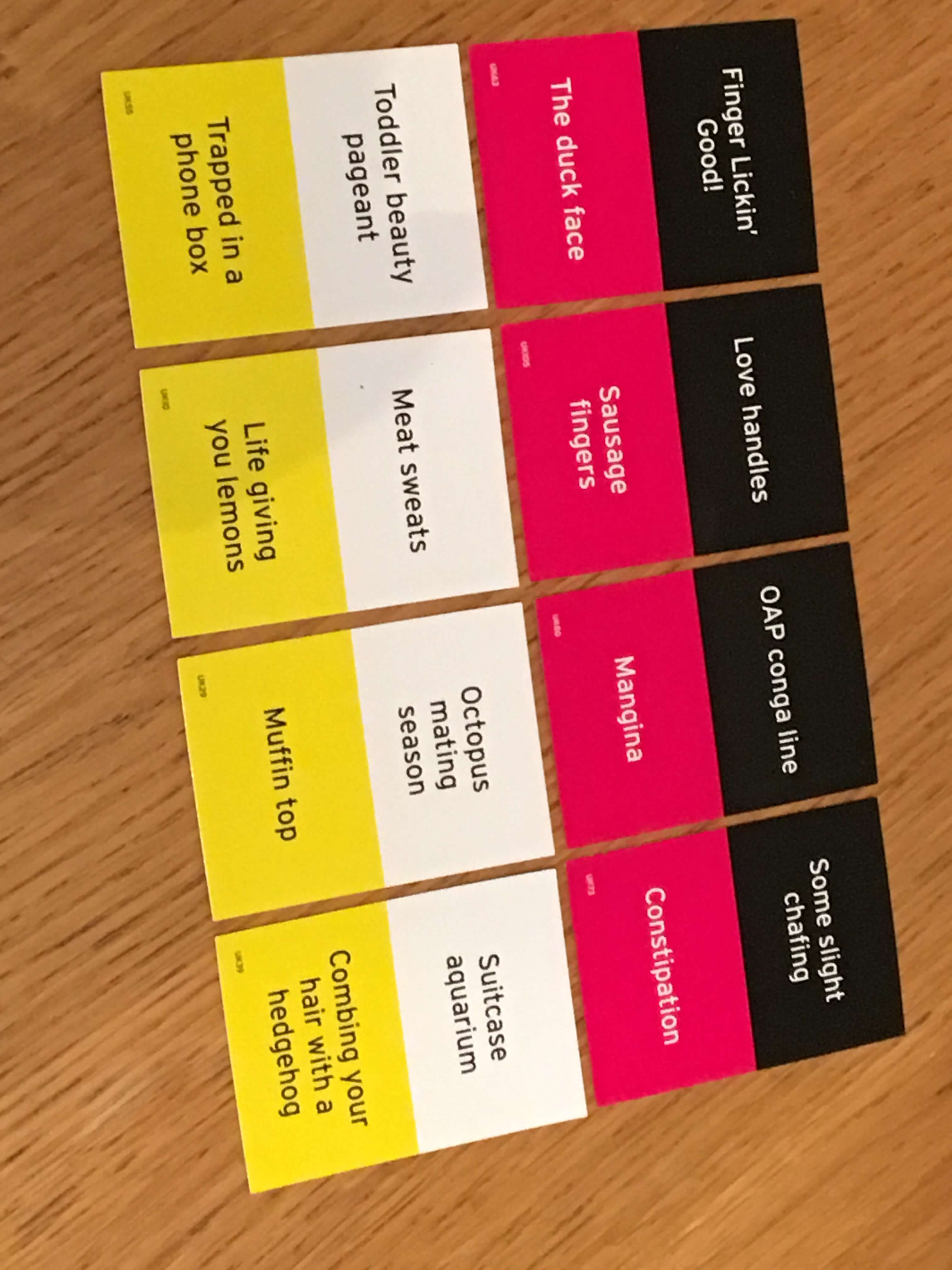 As each player receives the clipboard from their neighbour, they look at the picture, take a new (blank) card, then write what they believe the picture might have depicted. In this way, a card might begin with ‘side boobs’ on the official card, but a picture of a crescent moon next to some kind of stick-person could easily morph into a description of ‘The Grim Reaper riding a pig’. The next player receives that description and attempts to draw it on another card, each time clipping their written or visual interpretation over the previous one.