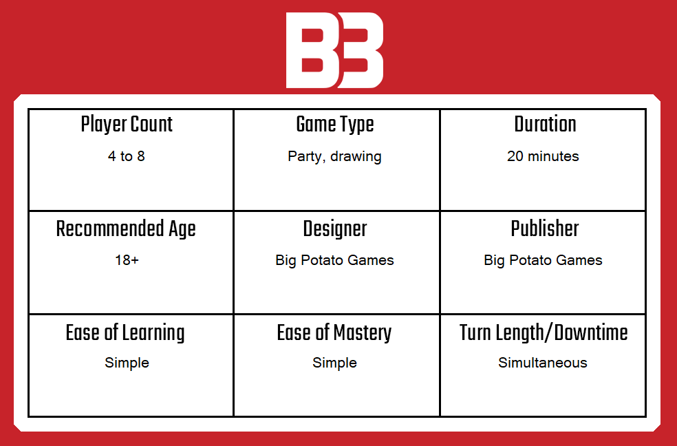 That said, I’d say that the majority of people in the target market for Scrawl are kind of okay with the kind of lewdness I am talking about. The cards feature quite modern, urban-dictionary-style descriptions of things to draw, so players anywhere between their teens and their mid-thirties will likely understand them and giggle simply at the concepts. Scrawl is designed first and foremost to make people laugh and enjoy themselves, so the competitive and scoring elements are fairly loose and, I dare say, quite secondary to the actual experience.