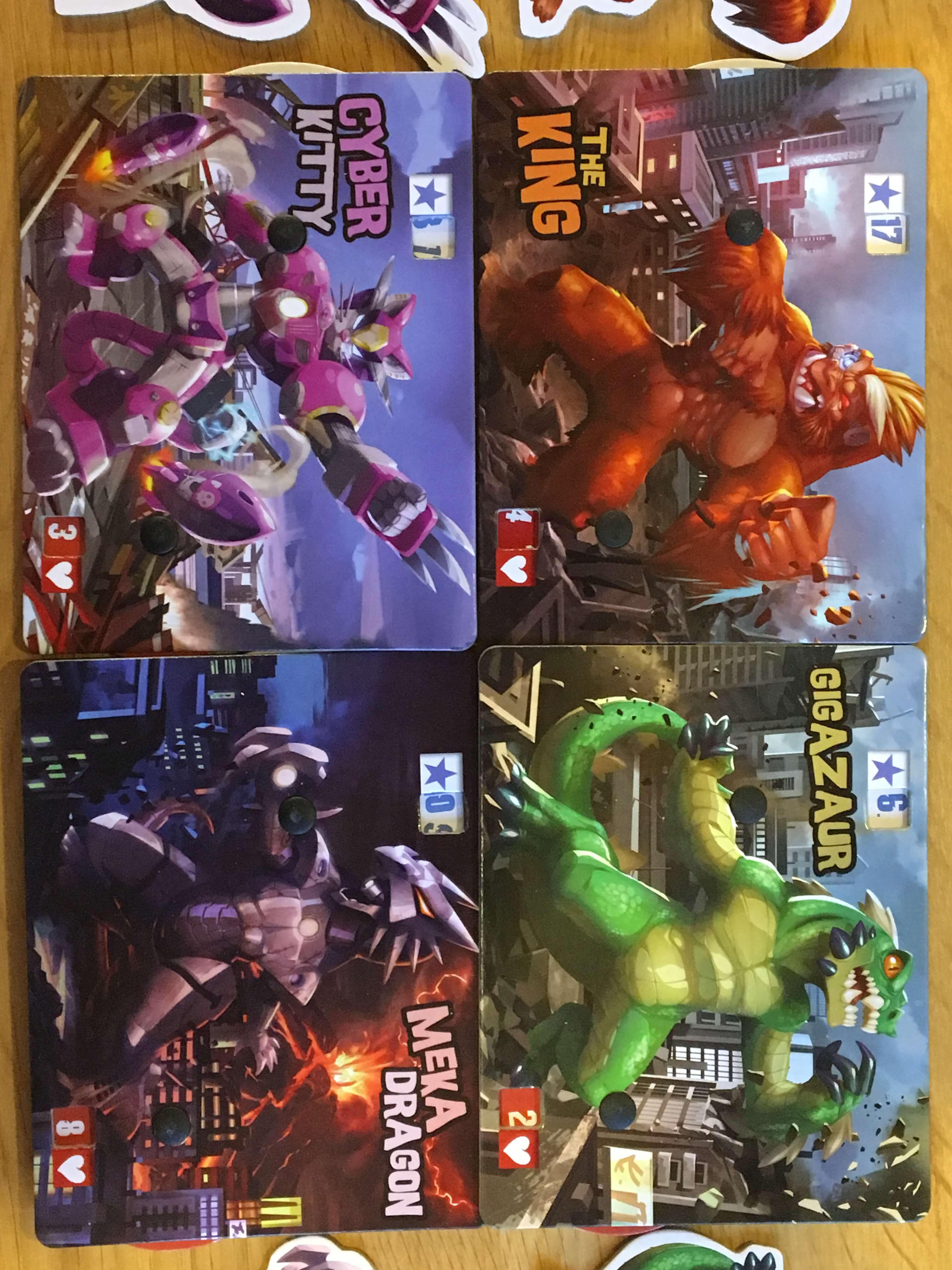 One of the best things about King of Tokyo is that it comes in a fairly small box, available at a sensible retail price. As a result, the components are simple but effective. The main attraction is undoubtedly the eight (six standard and two bonus) over-sized dice, each of which is customised specifically for the game and has a fantastic weight when rolled.