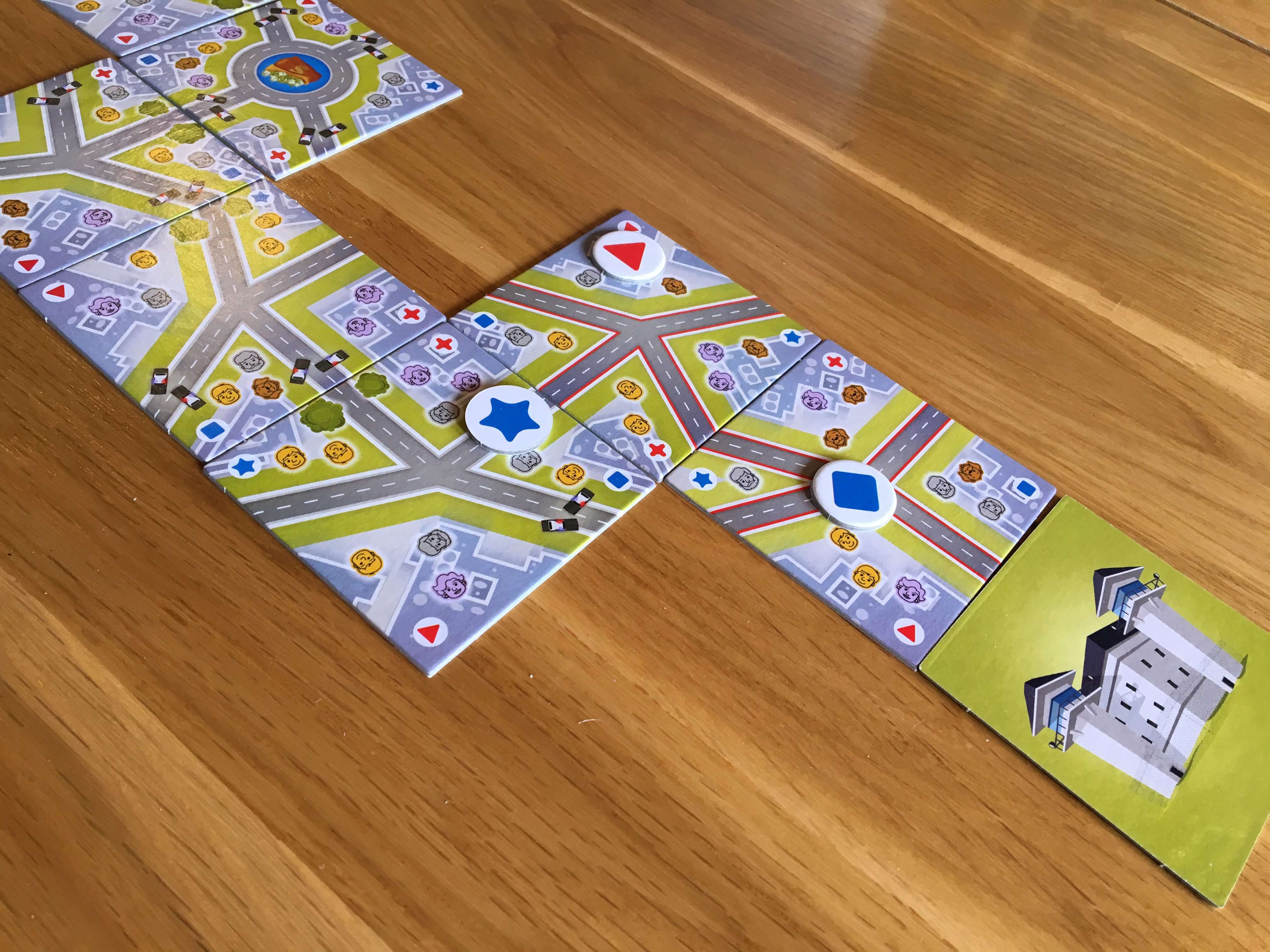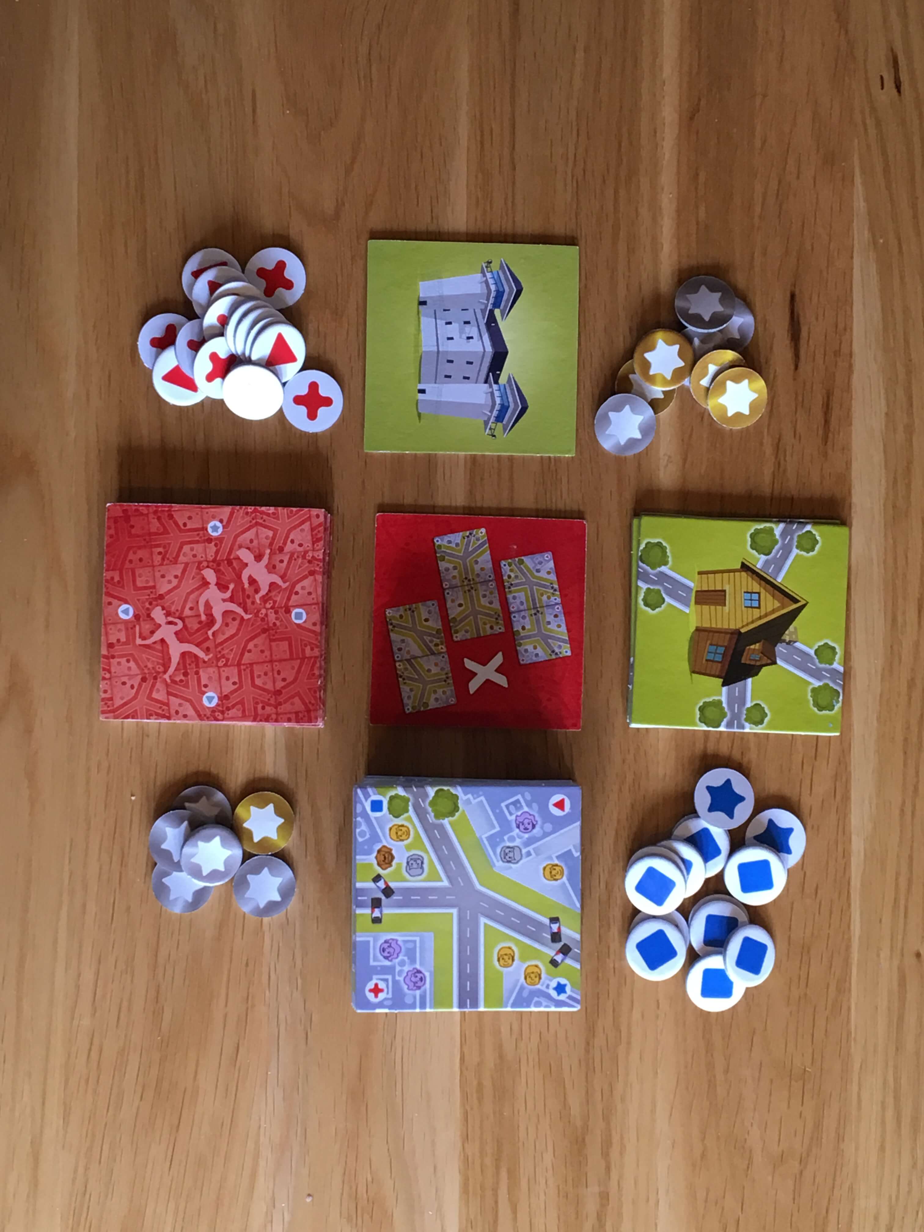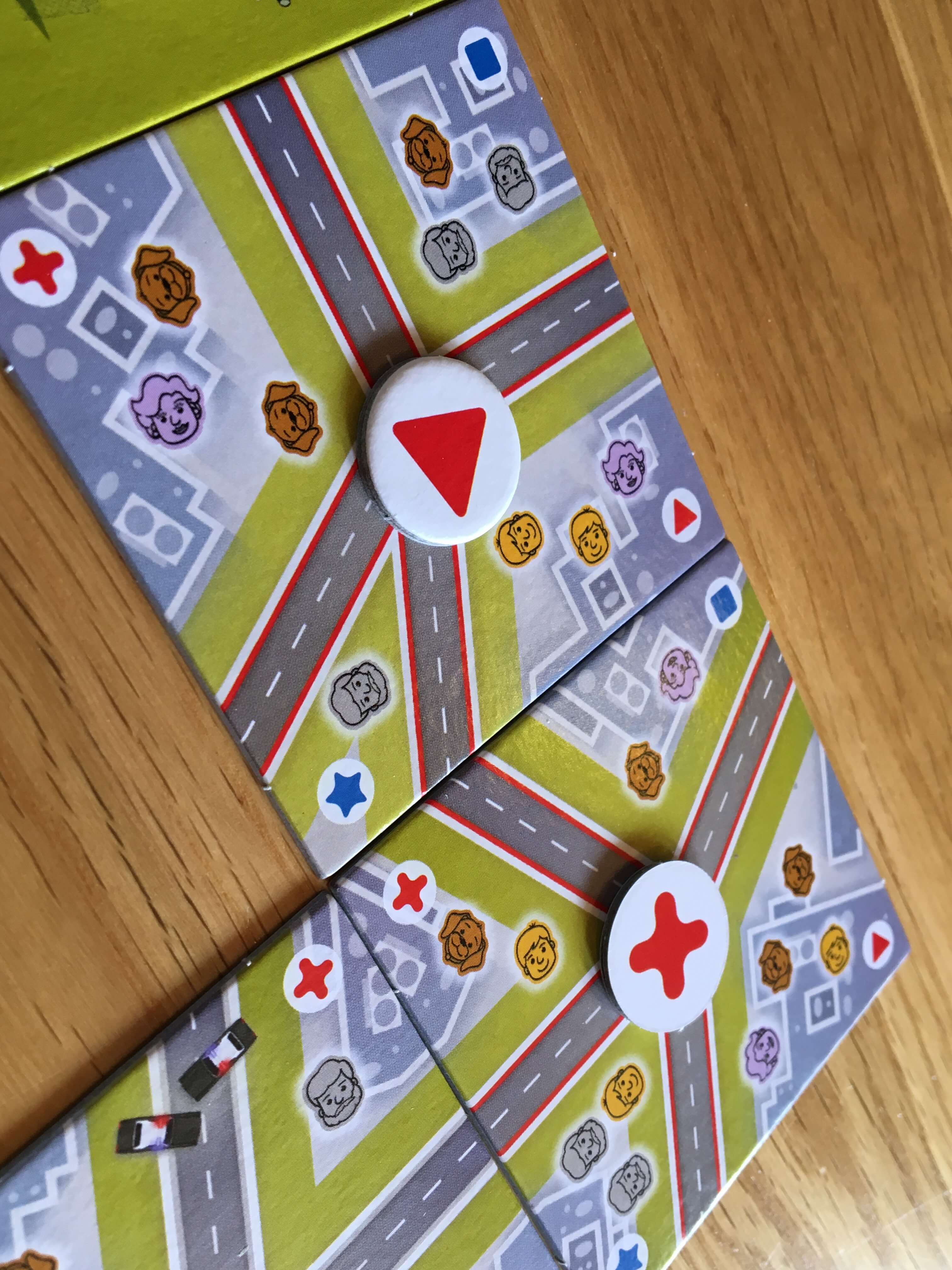 5 Minute Chase has an attractive, robust level of quality applied throughout, which is fitting given that the tiles are handled vigorously and often. The artwork is attractive and strikes a nice balance between clarity and complexity, which I think is intended to create the respective challenges of tile and token placement for players. I am fortunate enough to have fairly good eyesight when wearing glasses and I wouldn’t normally comment on something like this, but as I do play with a visually impaired gamer, I have to say that 5 Minute Chase isn’t fun for someone who struggles to see small symbols or subtle colours on a similar backdrop.